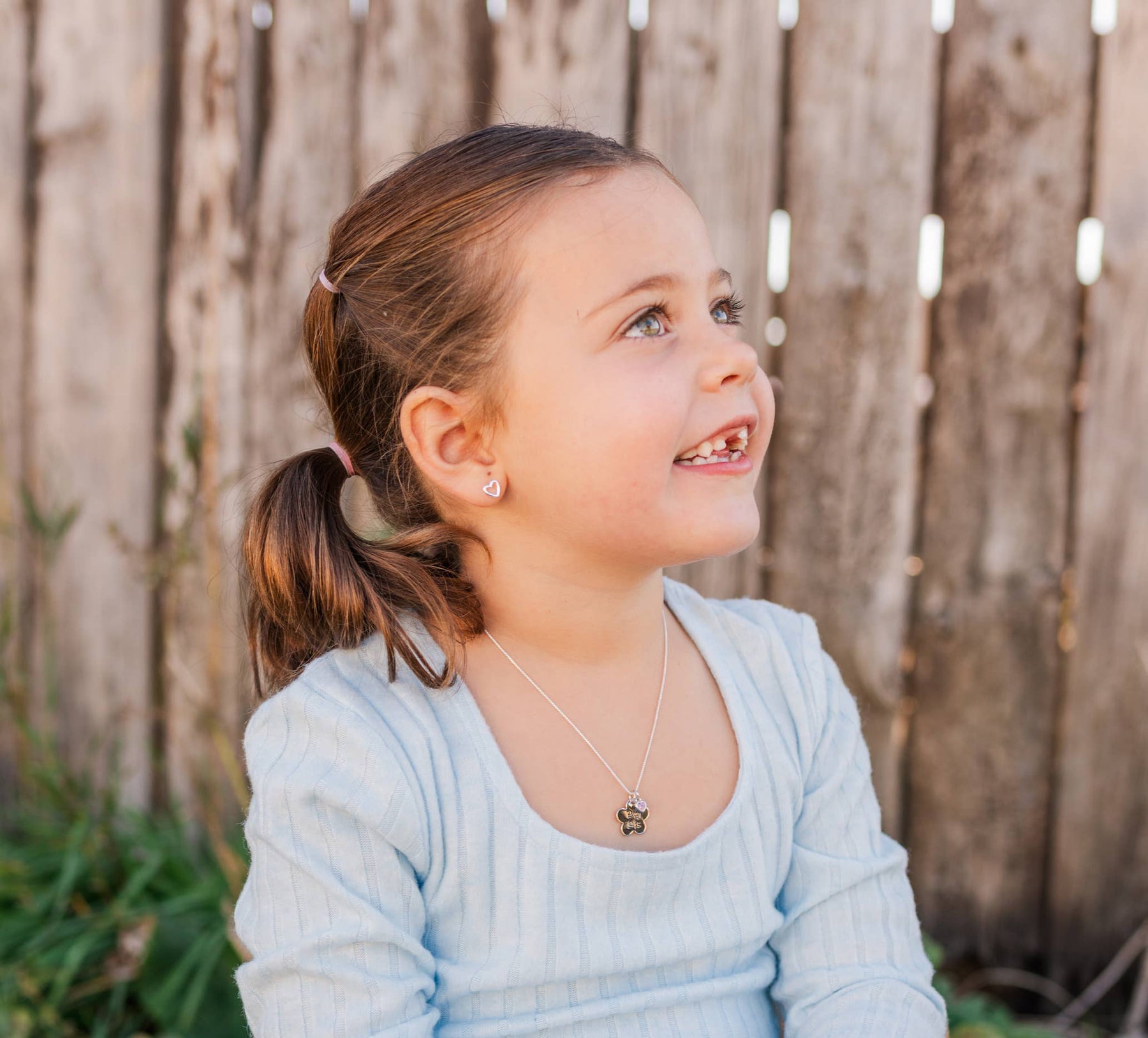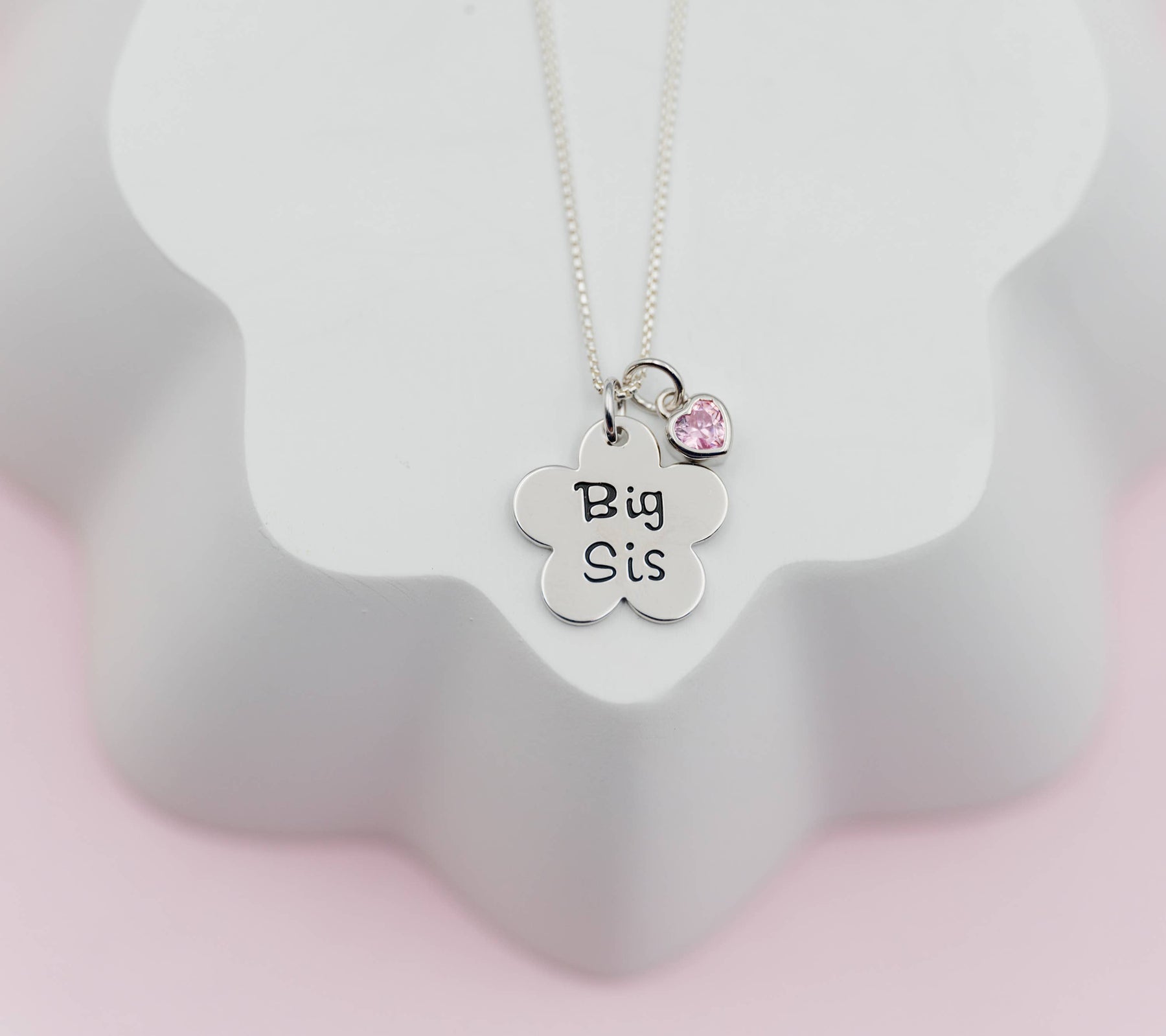 Celebrate her new role with this adorable sterling silver Big Sis necklace, featuring a sweet daisy charm and a pink sparkling heart accent. Paired with your choice of a 14” or 16–18” Italian chain, it’s a thoughtful keepsake she’ll treasure. Comes beautifully packaged in a kid-approved gift box.