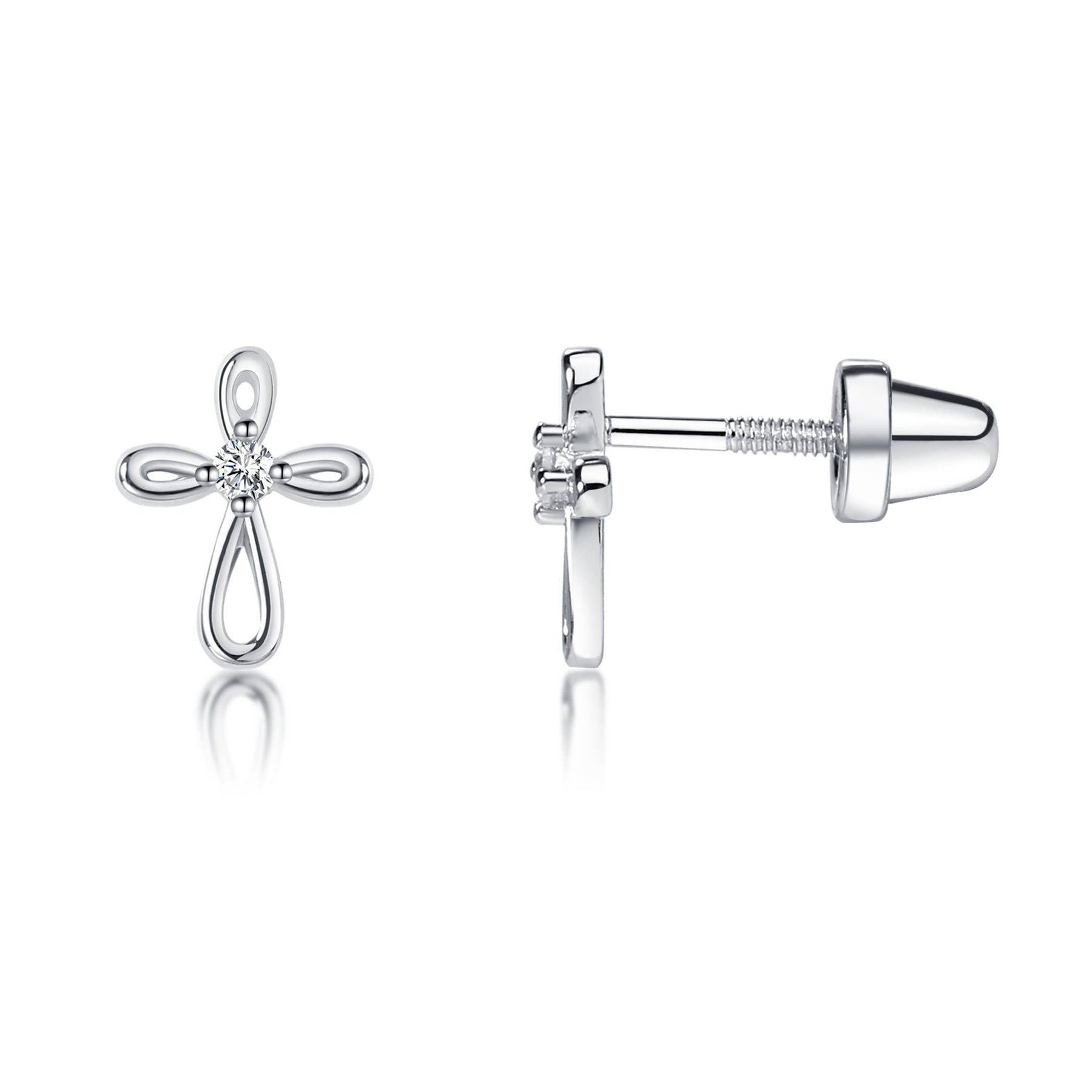 These sterling silver infinity cross earrings are beautifully designed for little girls, featuring clear sparkling CZ accents for a touch of shine. Finished with secure screw-back posts, they stay comfortably in place—perfect for active little ones. Each pair includes a hypoallergenic, anti-tarnish coating to keep them looking bright for years. Presented in a darling gift box, they make a meaningful and memorable First Communion gift.