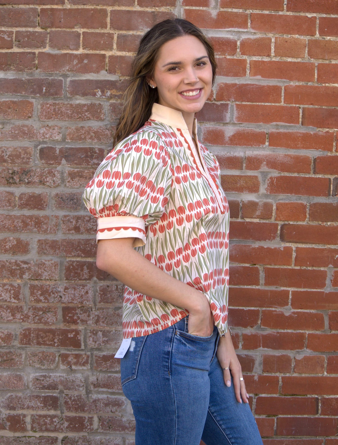 Elevate your casual wardrobe with this floral caftan-inspired top, featuring delicate contrast scallop trim for a feminine finish.