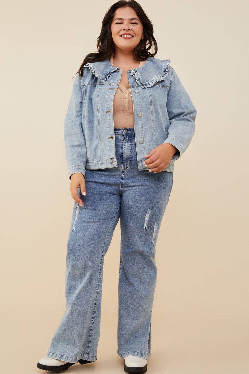 Make a statement with this women’s exaggerated ruffle collar denim jacket. Crafted from classic denim, it features a bold, oversized ruffle collar that adds a playful, fashion-forward twist to a timeless silhouette. Designed for layering over dresses, tops, or tees, this versatile jacket brings effortless style to casual or elevated outfits. Its structured fit and durable fabric ensure both comfort and lasting wear, making it a must-have piece for your wardrobe.