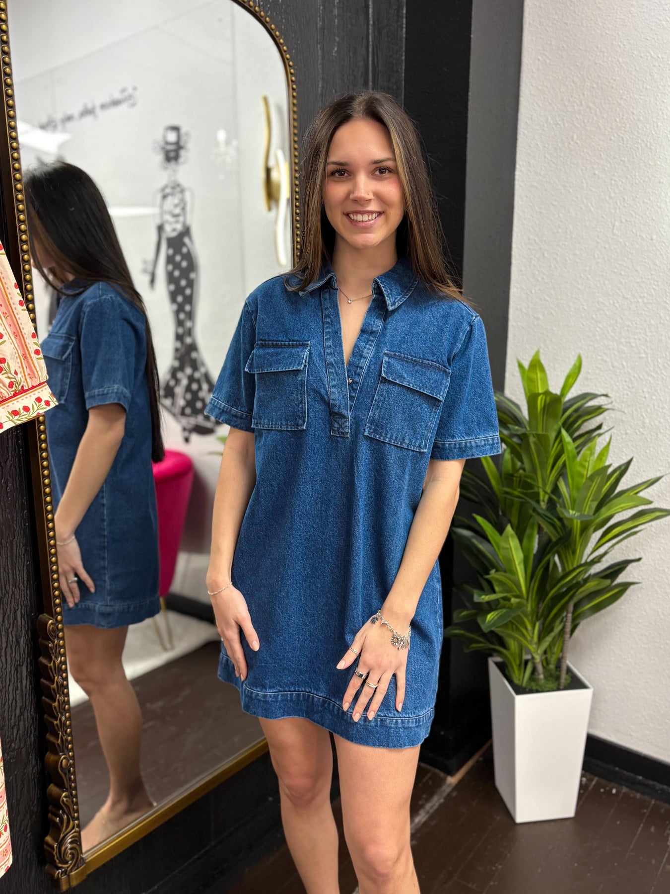 Effortlessly casual and chic, this washed denim mini dress features a classic collar, V-neck opening, short sleeves, and practical front pockets. Crafted from a soft, breathable blend of 90% cotton and 10% polyester, it offers comfort and ease for all-day wear. The relaxed mini silhouette makes it perfect for layering, running errands, or weekend outings, while the timeless denim wash adds versatile style to your wardrobe.