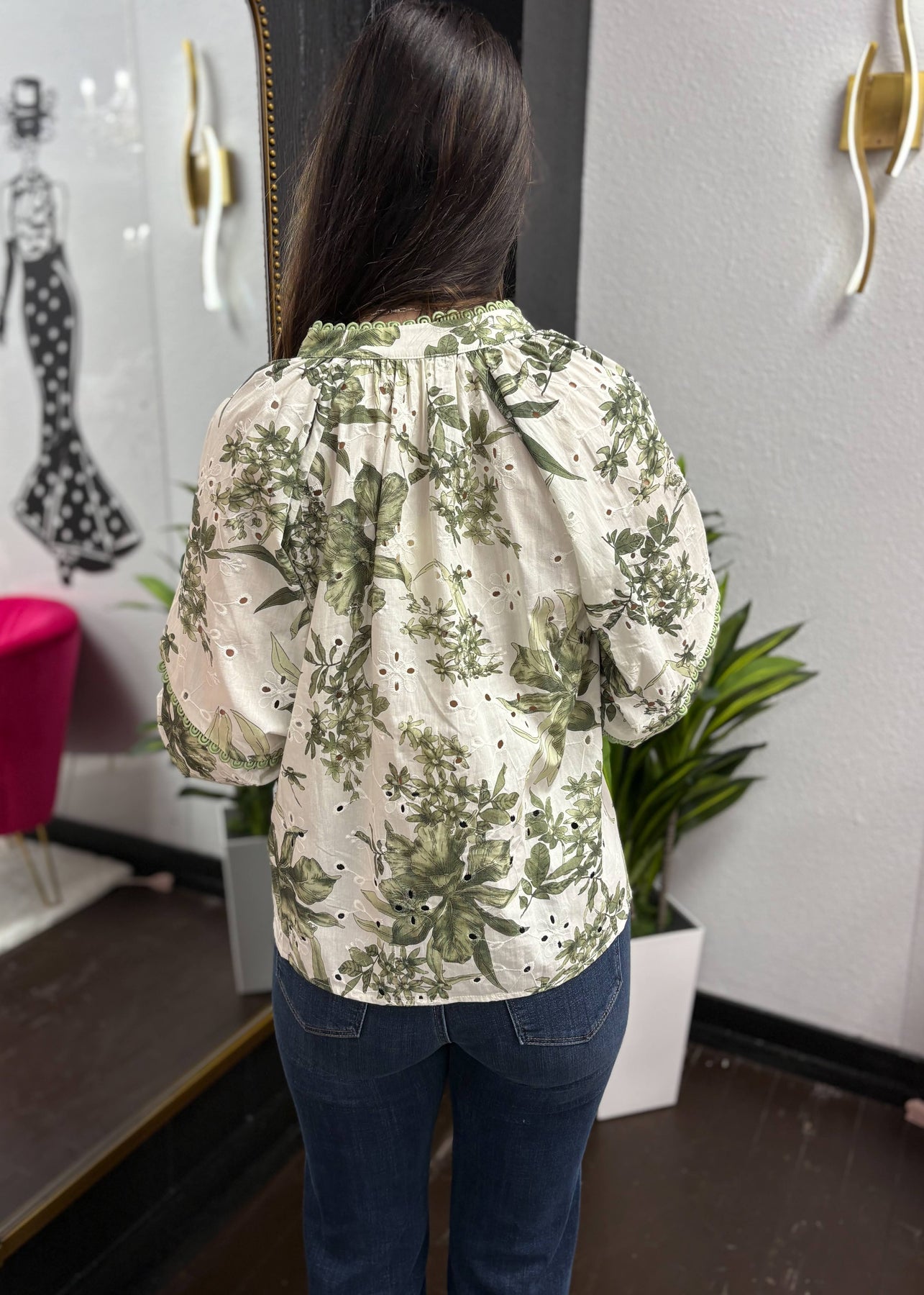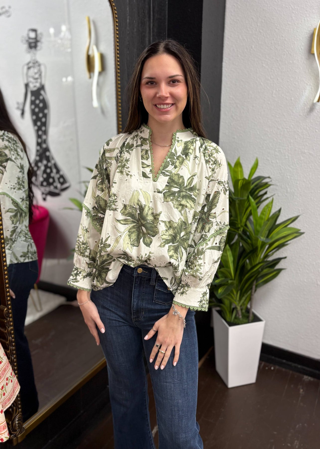 This long-sleeve botanical print blouse combines delicate floral charm with subtle feminine details. Featuring a split neckline and lace trim along the edges, it offers a soft, romantic silhouette that’s both elegant and effortless. Lightweight and flowy, it pairs perfectly with jeans, skirts, or tailored pants for a versatile, polished look.