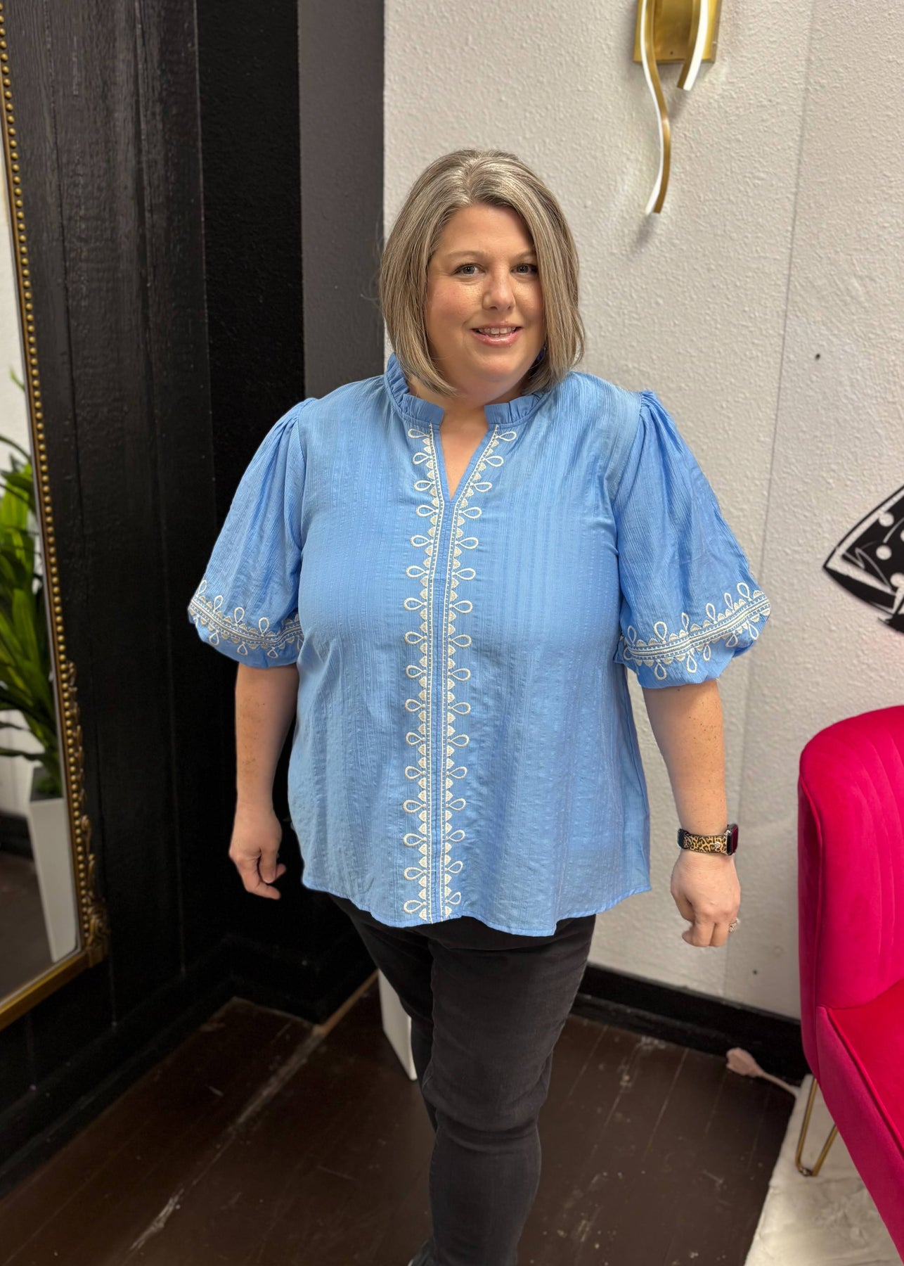 Elevate your everyday wardrobe with this solid embroidered blouse, featuring delicate detailing and short bubble sleeves for a subtle, feminine touch. Crafted from a soft, lightweight blend of 81% Tencel and 19% nylon, with a smooth 100% polyester lining, it offers comfort, breathability, and a flattering drape. With a total length of 27”, this versatile top pairs effortlessly with jeans, skirts, or tailored pants for both casual and polished looks.