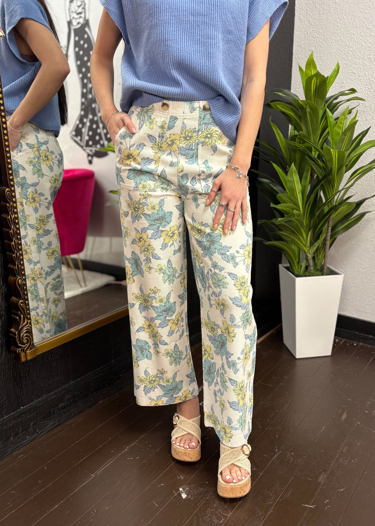 Effortlessly feminine with a relaxed silhouette, these floral print wide leg pants bring easy elegance to everyday dressing. Designed in a lightweight woven fabric, they feature a flattering wide leg fit with a button-detailed waistband and classic zip-fly closure. Functional front and back pockets add a touch of practicality, while the breathable, non-sheer fabric keeps them comfortable all day long. Style them with a tucked-in blouse or casual knit for a look that feels both polished and carefree.