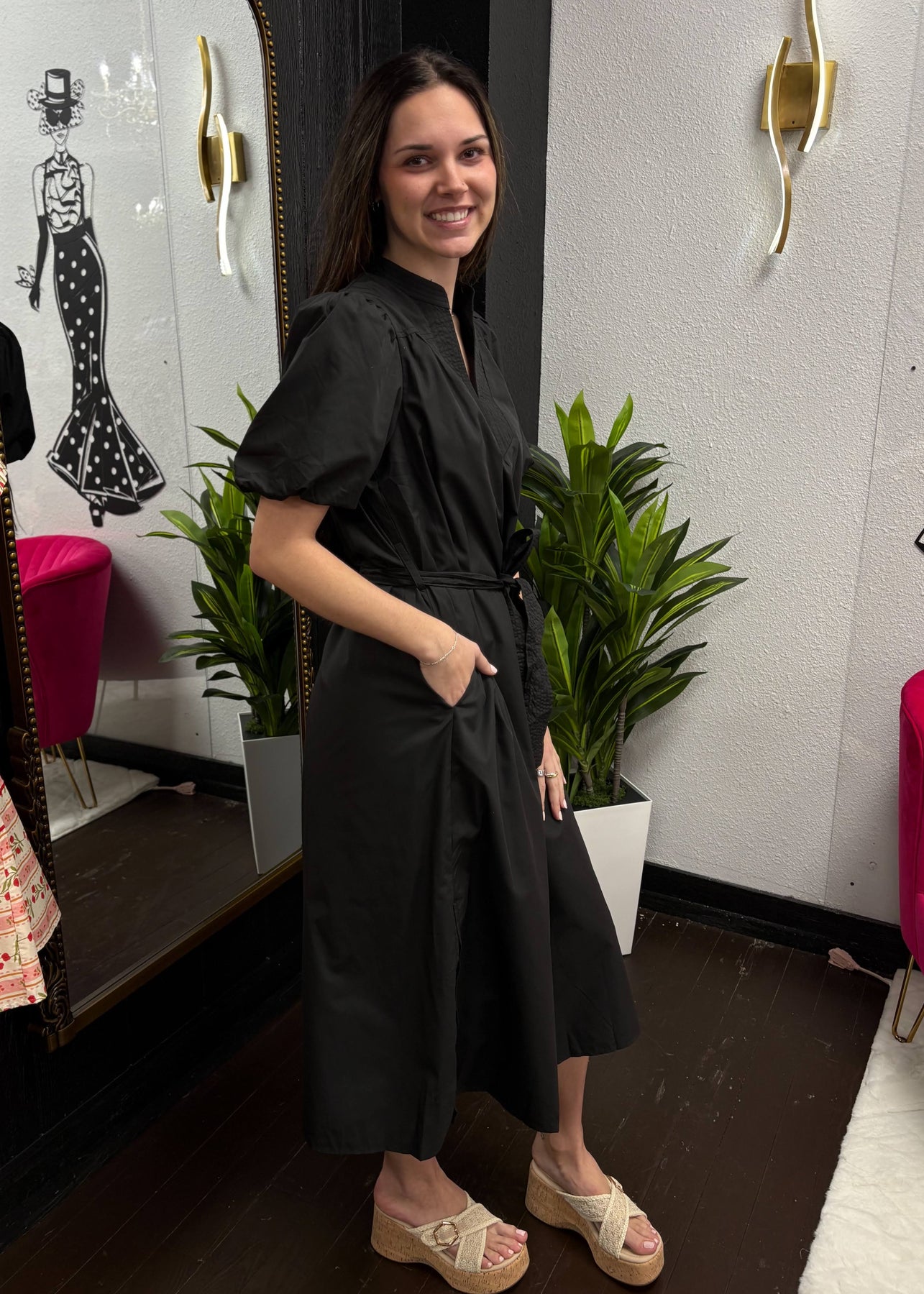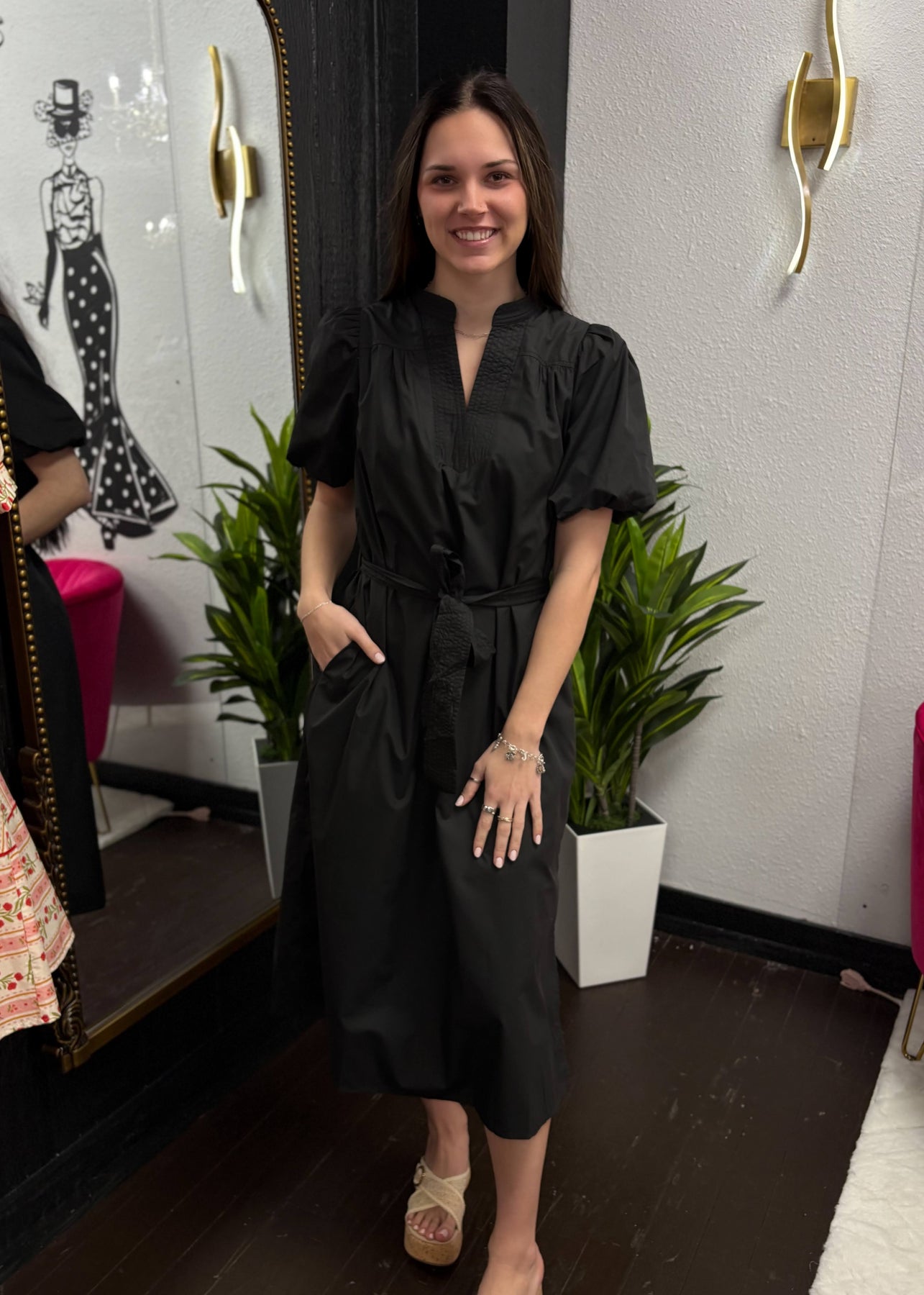 The Soft Shadow Midi Dress is a chic and versatile black dress designed with a flattering midi length. Featuring puff sleeves, a split neckline, and a self-tie belt that cinches the waist, it creates an effortlessly feminine silhouette. Lightweight and flowy, this dress transitions seamlessly from daytime elegance to evening sophistication, making it a wardrobe staple for any occasion.