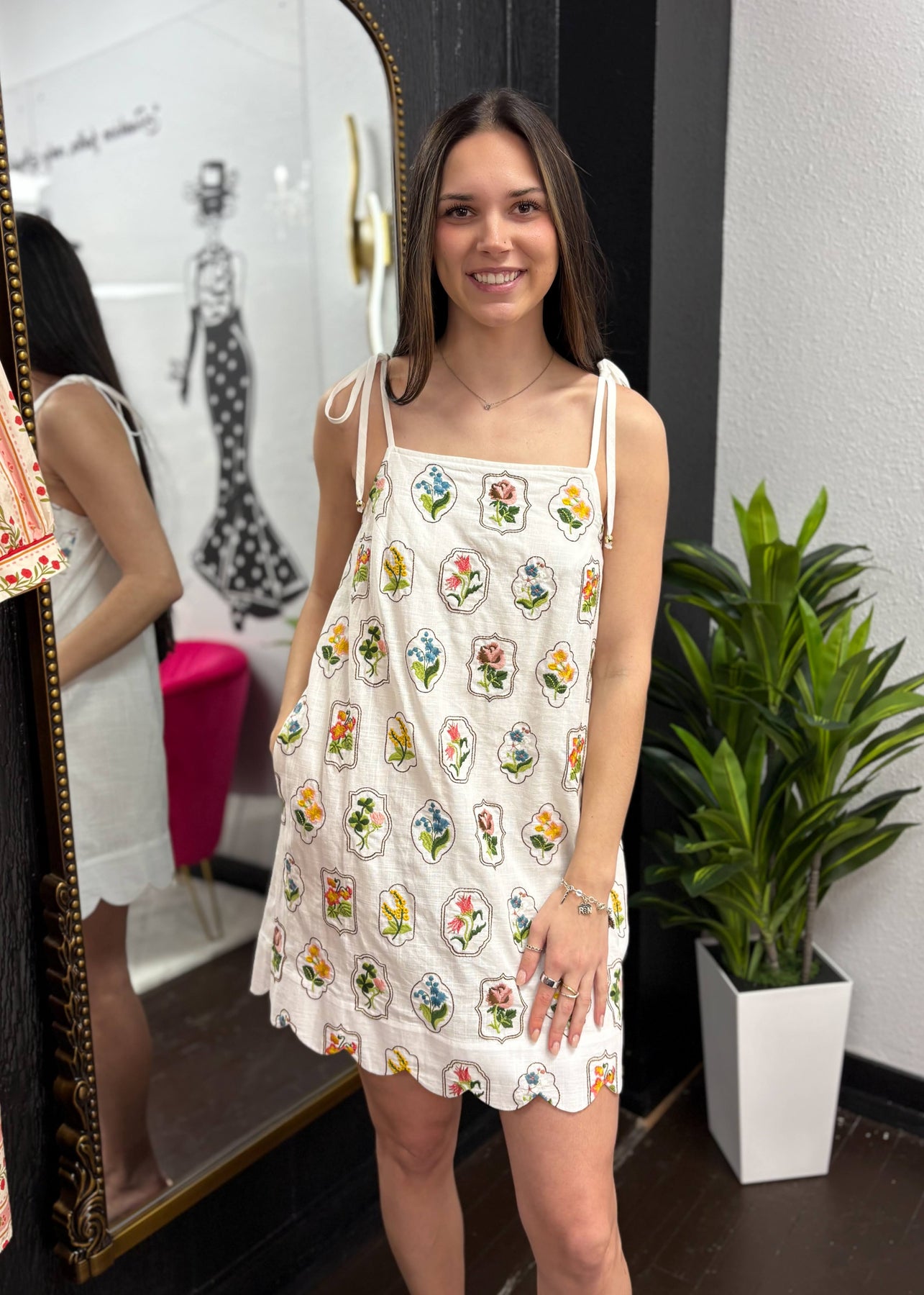 This mini dress features a delicate drawn floral print on a creamy neutral base. Designed with slender adjustable straps and a relaxed silhouette, it offers a breezy, comfortable fit that’s perfect for warm-weather days. The subtle scalloped hem adds a touch of vintage-inspired charm, while the lightweight fabric keeps it easy and wearable from brunch dates to garden parties. Pair it with sandals for daytime or dress it up with wedges and delicate jewelry for an elevated look.
