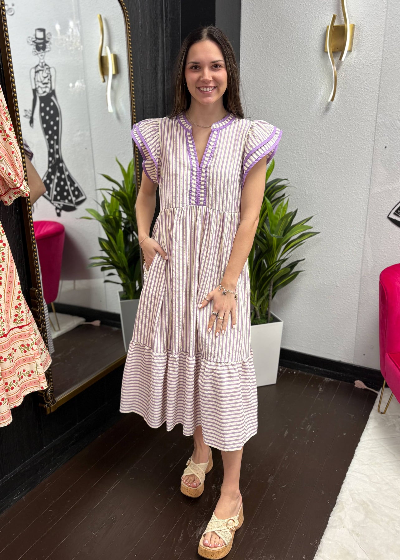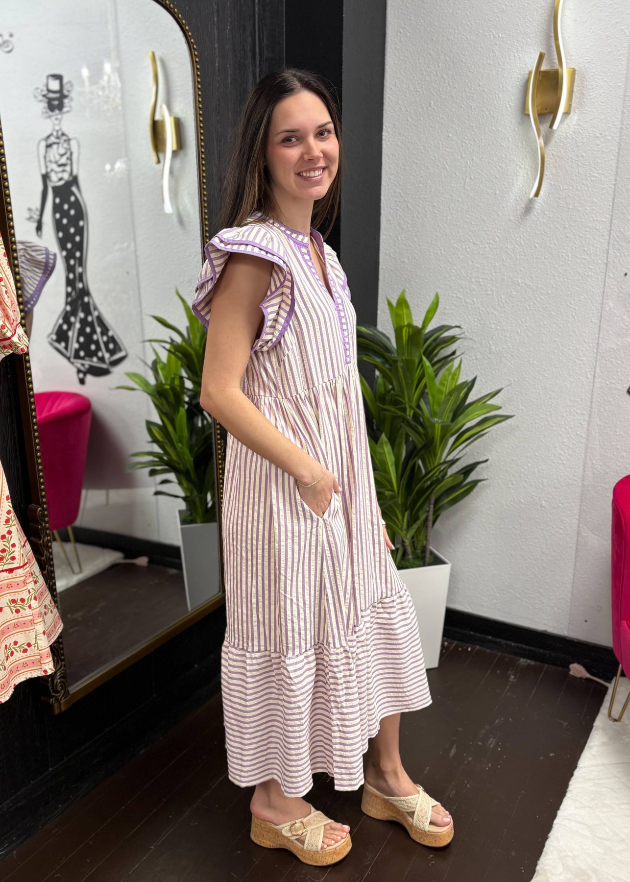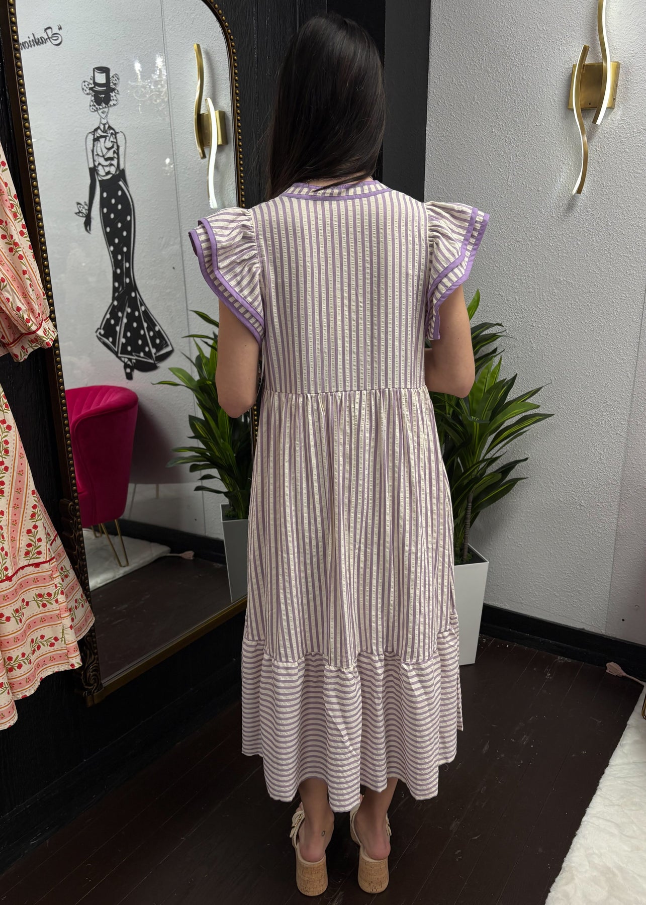 This feminine dress features a textured stripe pattern with tiered ruffle detailing for effortless movement and charm. Designed with flutter sleeves accented by contrast binding, it offers a refined yet playful touch. The lightweight woven fabric is fully lined for comfortable, confident wear, while side pockets add everyday functionality. An easy, flattering silhouette that transitions seamlessly from daytime outings to special occasions.