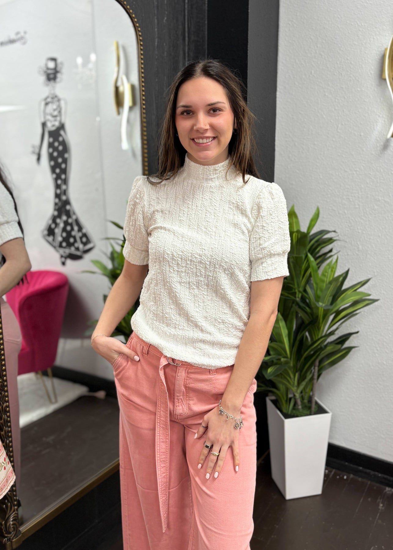 A timeless essential with a modern edge. This white textured mock neck top features a fitted silhouette and soft stretch for a flattering, comfortable fit. Perfect for layering or wearing solo, it effortlessly elevates jeans, trousers, or skirts for a polished everyday look.