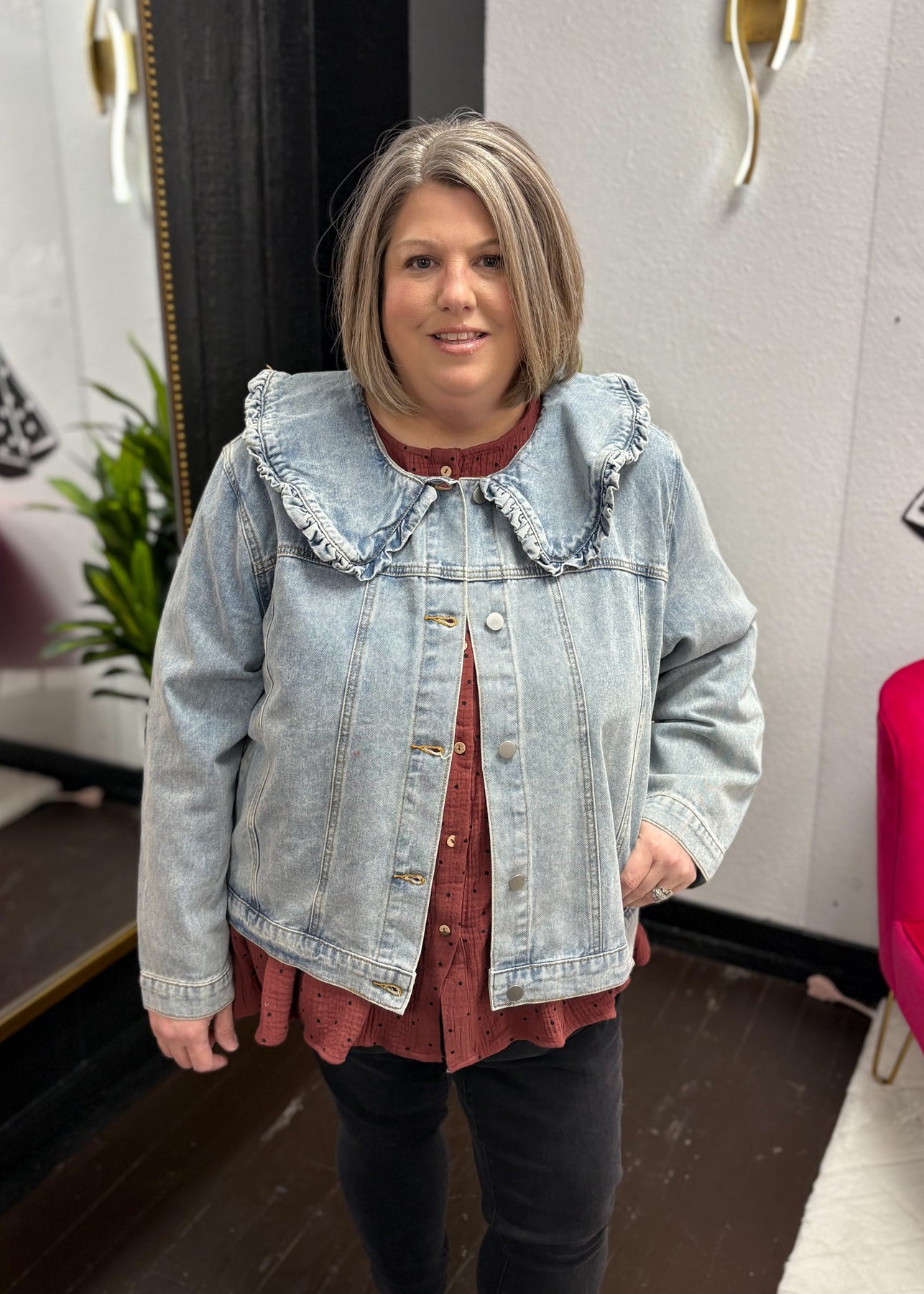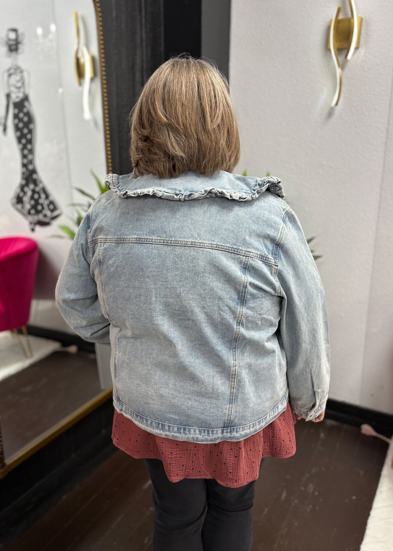 Make a statement with this women’s exaggerated ruffle collar denim jacket. Crafted from classic denim, it features a bold, oversized ruffle collar that adds a playful, fashion-forward twist to a timeless silhouette. Designed for layering over dresses, tops, or tees, this versatile jacket brings effortless style to casual or elevated outfits. Its structured fit and durable fabric ensure both comfort and lasting wear, making it a must-have piece for your wardrobe.