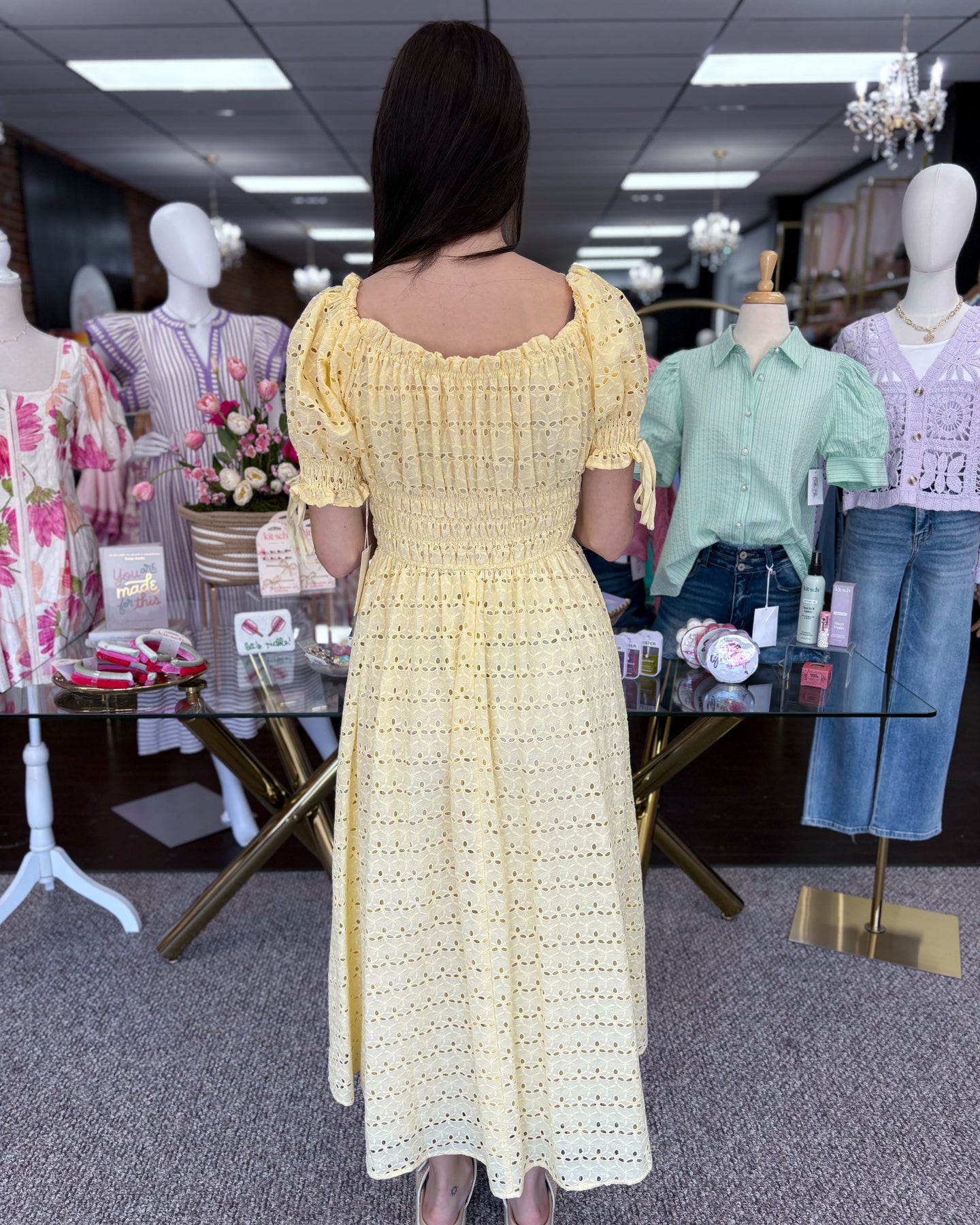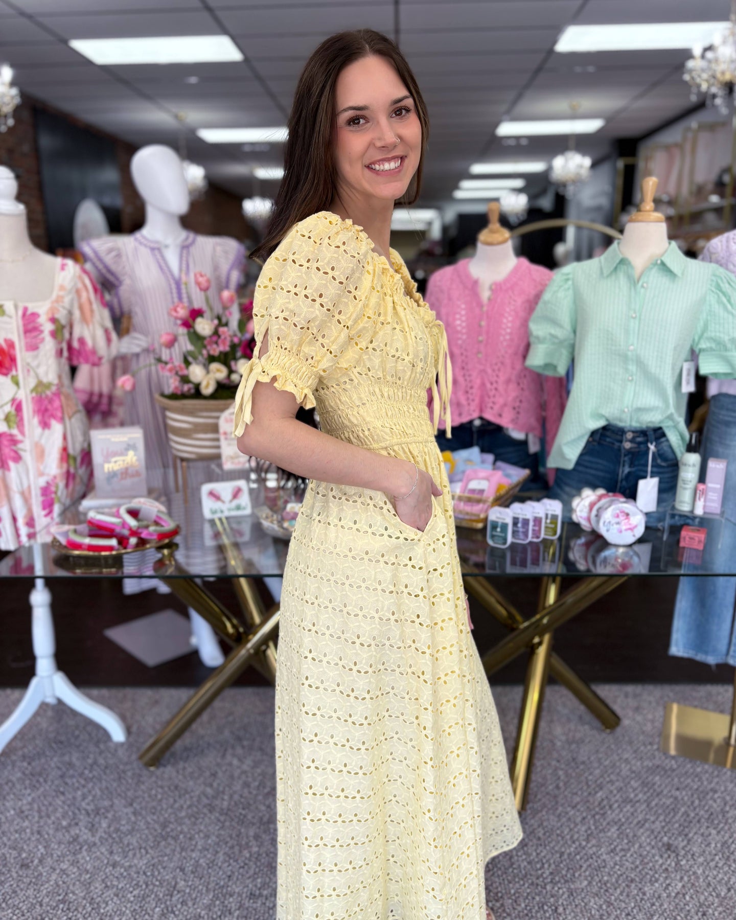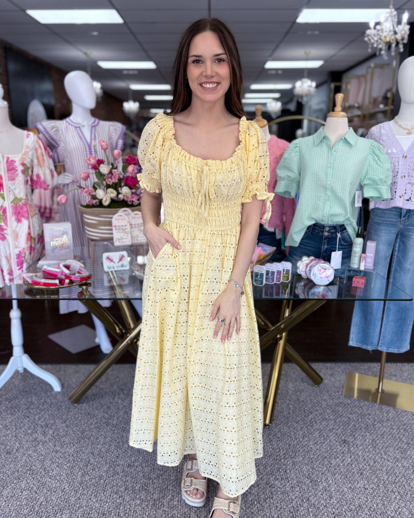 Sun-kissed and effortlessly feminine, the Golden Hour Garden Dress is made for warm days and easy elegance. Designed in soft yellow eyelet lace, this flowing maxi features a smocked bodice, romantic puff sleeves with delicate tie details, and a flattering square neckline that can be worn on or off the shoulders.