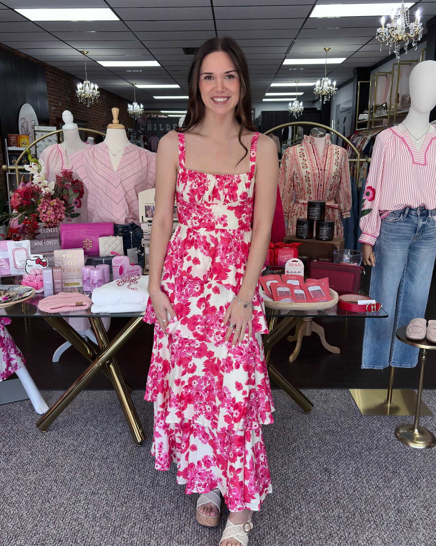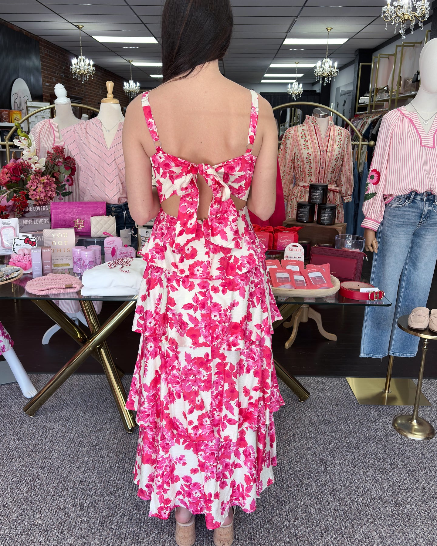 Softly romantic and effortlessly chic, this floral maxi dress brings timeless elegance to every occasion. Crisp white fabric is adorned with vibrant pink blooms, while a fitted bodice and delicate thin straps create a flattering, feminine silhouette. The tiered skirt cascades in soft ruffles, adding graceful movement and a hint of romantic drama. Lightweight and airy, it’s perfect for garden parties, bridal showers, vacations, or any moment that calls for standout, polished style.