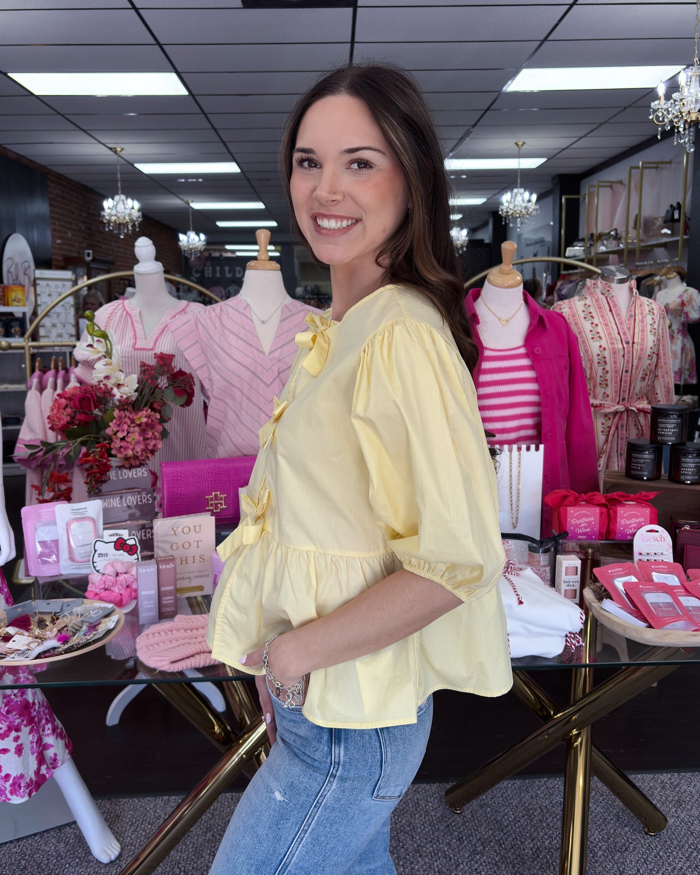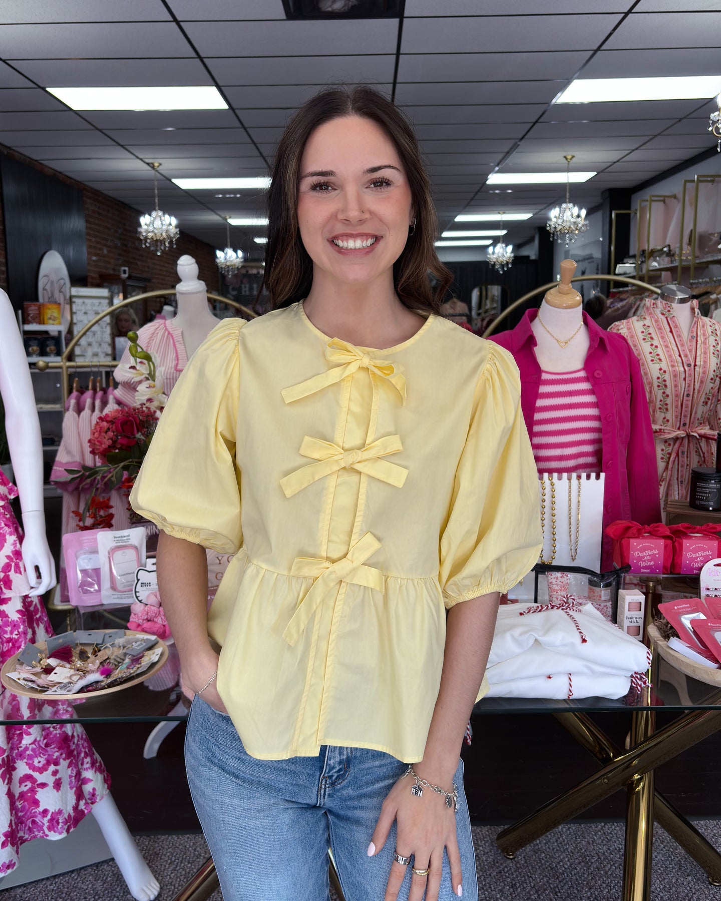Fresh, feminine, and full of sunshine — this butter yellow poplin blouse is made to brighten your day. Designed with soft puff sleeves, a flattering peplum hem, and a delicate front tie ribbon, it blends playful detail with timeless charm.