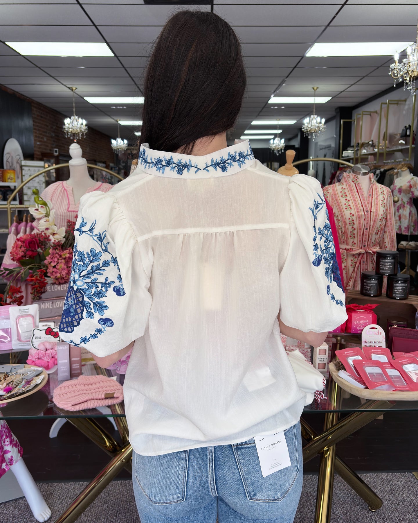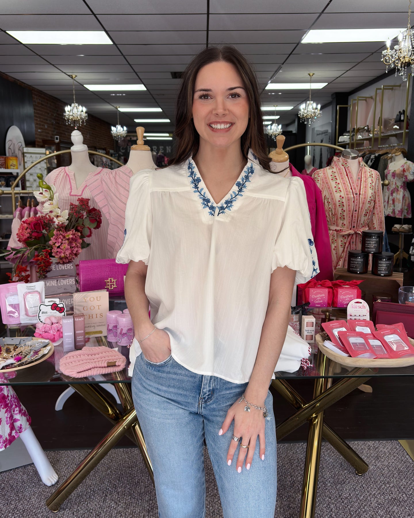 Delicate and effortlessly feminine, the Elowen Top brings subtle charm to everyday dressing. A flattering V-neckline is beautifully accented with floral embroidery along the neckline and sleeves, adding soft texture and artisanal detail.