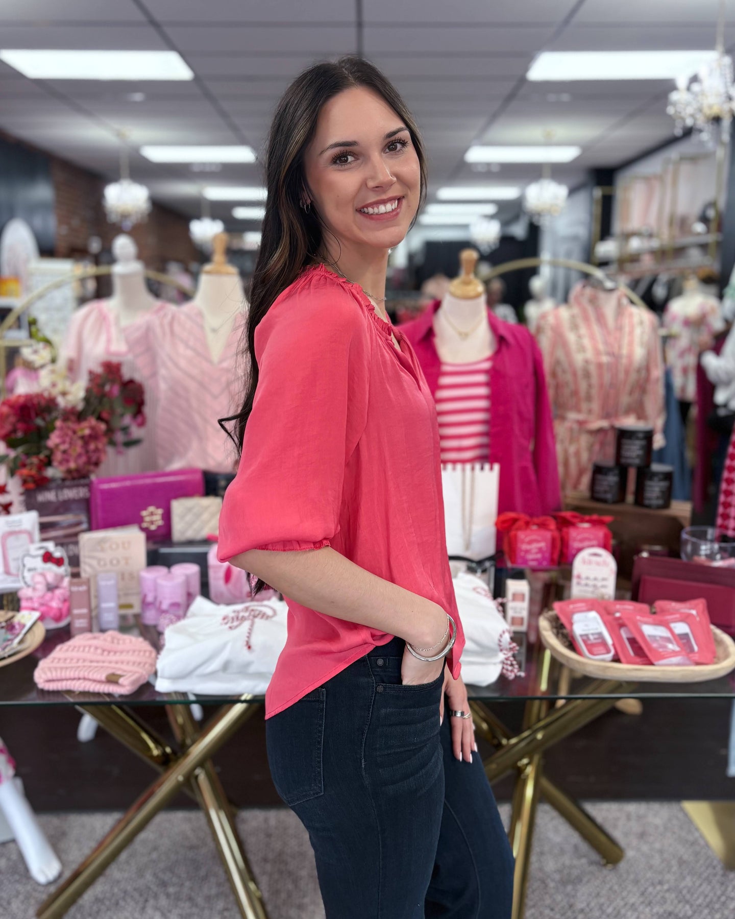 Softly feminine and quietly sophisticated, this button-front woven top blends timeless polish with effortless charm. Delicate ruffle detailing adds gentle movement, while 3/4 sleeves provide comfortable, year-round coverage. Crafted in lightweight woven fabric, it drapes beautifully for a flattering, flowing fit that feels as good as it looks.