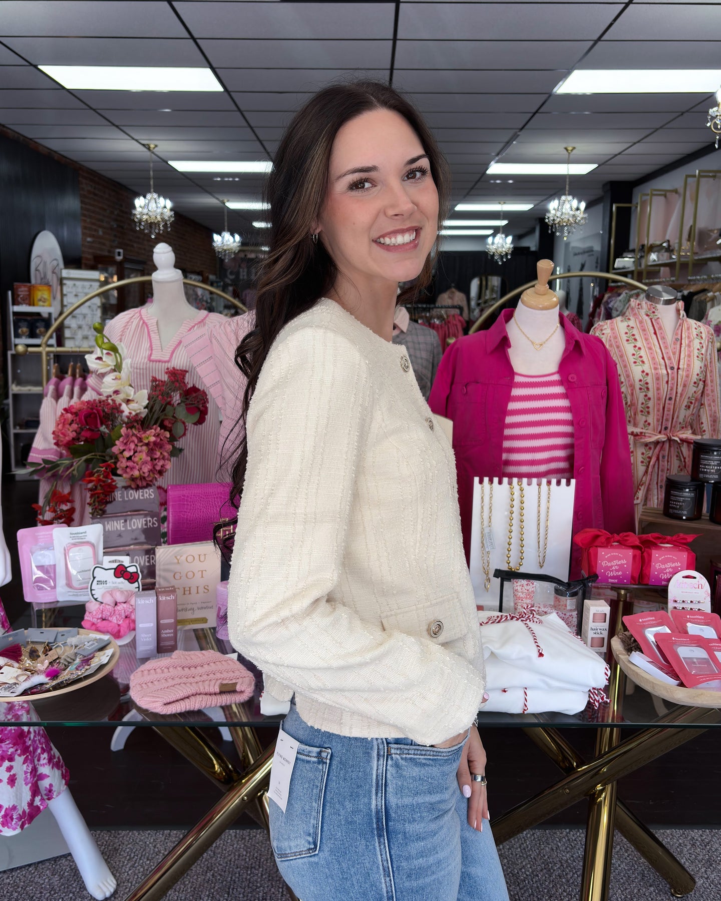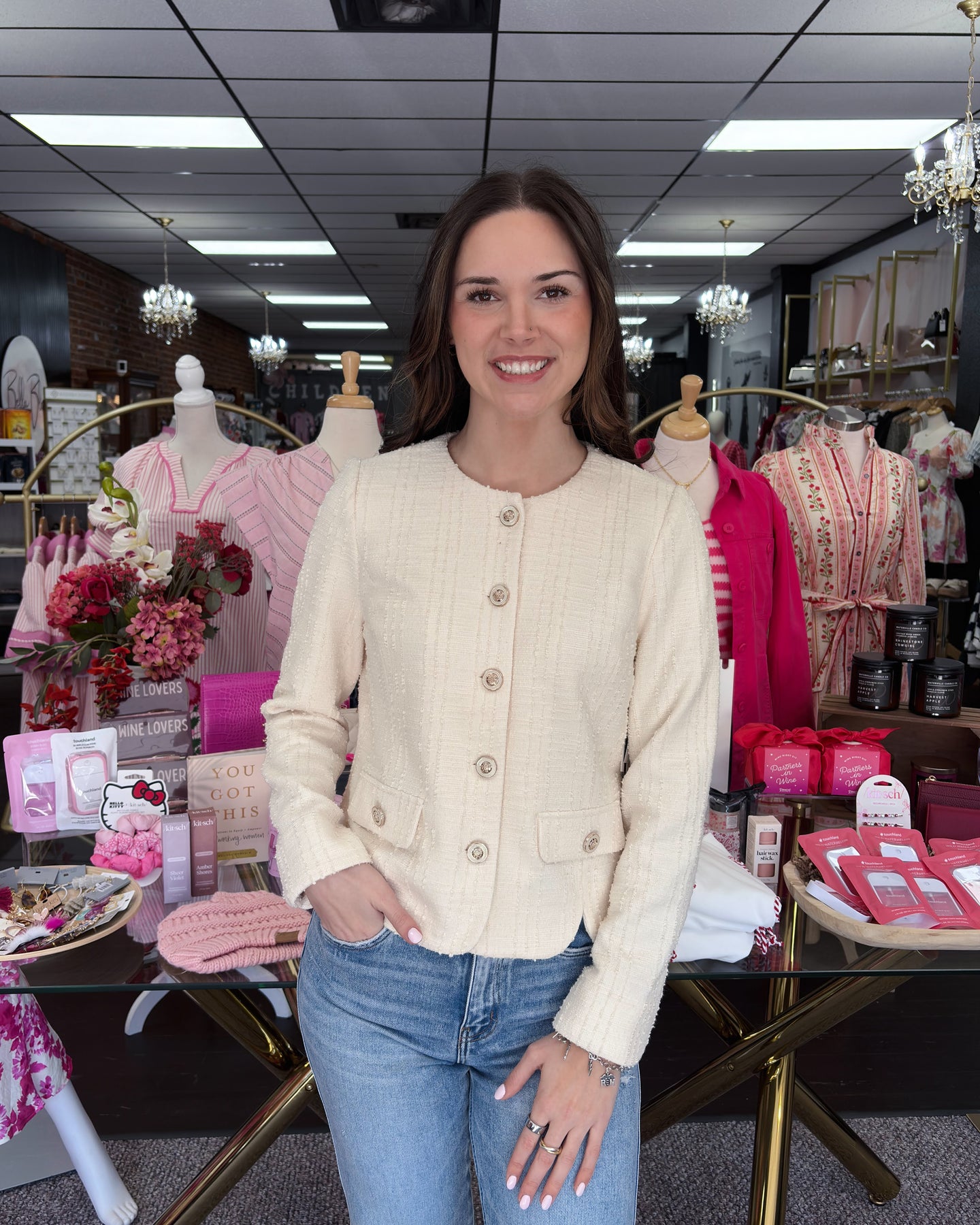 Chic and timeless, the Liverpool Collarless Jacket is a standout layering piece with refined feminine detail. Crafted in a textured white bouclé fabric, this jacket features a clean, collarless neckline and elegant scalloped hem for a soft, elevated finish. Button-front detailing and functional pockets add both style and practicality, making it as wearable as it is polished. Perfect for dressing up denim or pairing with tailored trousers, this versatile jacket transitions seamlessly from day to evening with effortless sophistication.