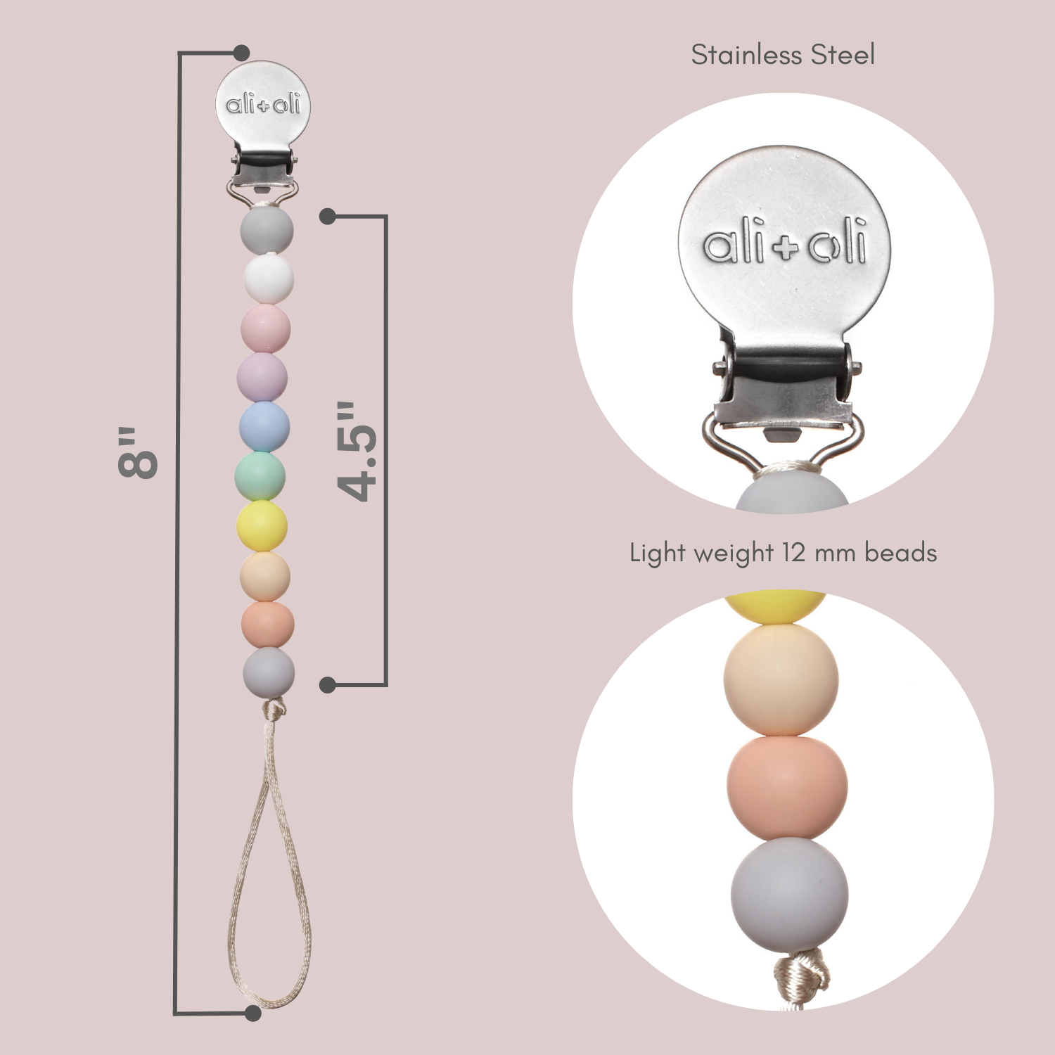Thoughtfully designed for modern parents and precious little ones, the Ali+Oli Silicone Pacifier Clip is both stylish and safe. Crafted from 100% food-grade silicone, this everyday essential is free from BPA, phthalates, lead, cadmium, and PVC, giving you peace of mind with every use. Measuring a safe eight inches in length, it keeps pacifiers within reach while meeting safety standards for your baby. Functional, durable, and gift-worthy, this pacifier clip makes a perfect addition to any baby registry or a sweet, practical present for new parents.