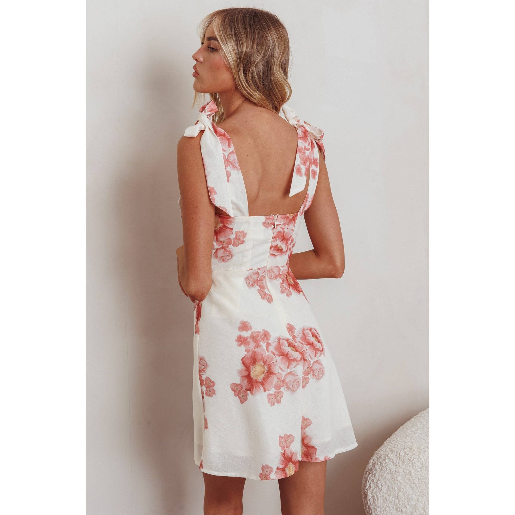 Feminine and effortlessly charming, this floral mini dress is designed to turn heads from every angle. Featuring adjustable tie shoulder straps and a flattering V-neckline, it flows into a softly structured silhouette that feels both playful and polished. The back reveals a modern square neckline with a hidden zipper for a smooth, tailored finish. Fully lined for comfort and coverage, this mini is perfect for brunch dates, garden parties, or sunny day celebrations. Pair it with sandals for daytime ease or dress it up with heels for a romantic evening look.