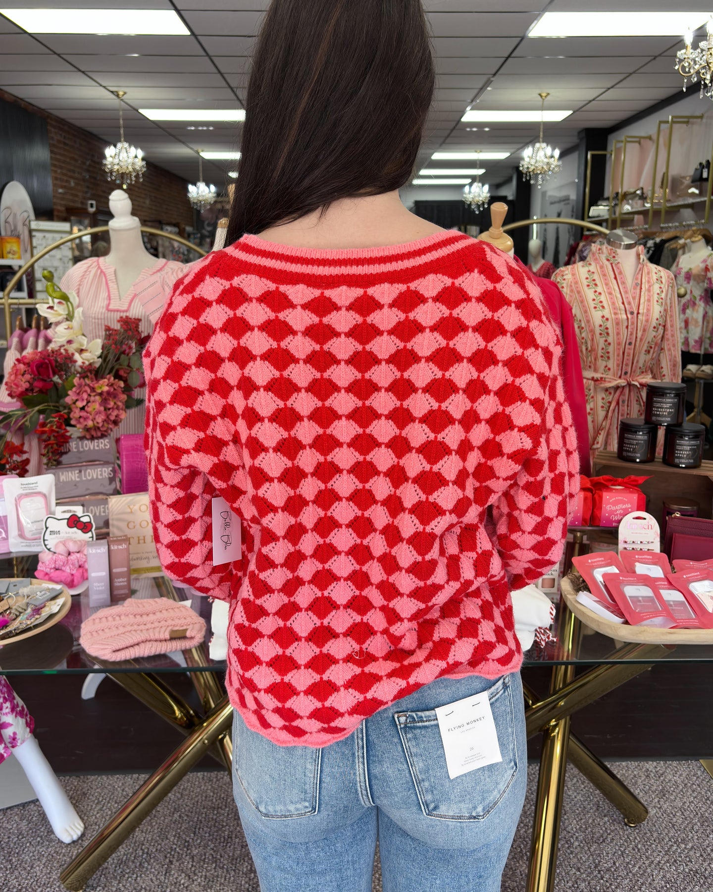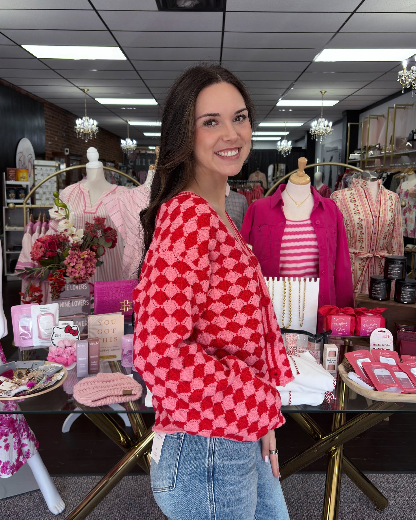Softly playful and effortlessly chic, this fan-inspired knit cardigan adds boutique-forward charm to your everyday wardrobe. Vibrant two-tone pink patterns create eye-catching appeal, while a flattering V-neckline, statement buttons, and softly ribbed trim bring polished detail. Cozy yet stylish, it layers beautifully over denim or tailored pieces for a look that’s both fun and refined.