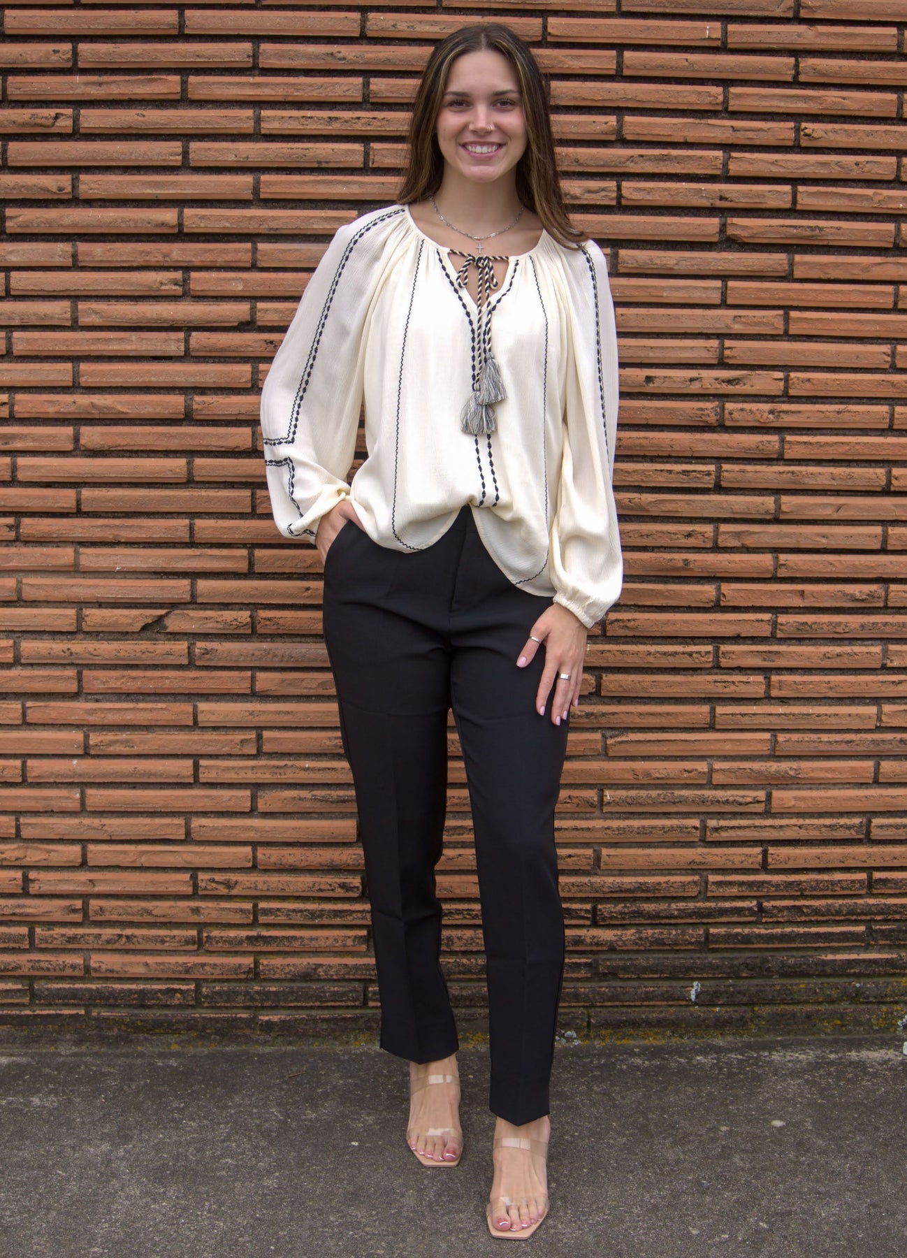 Light, romantic, and effortlessly chic—this raglan blouse blends a breezy silhouette with delicate embroidered details and soft shirring for a touch of charm. A tassel-tied V-neckline and elasticated wrists keep things easy and feminine, while the double-layer design offers just the right amount of coverage. Perfect from sunlit strolls to candlelit evenings.