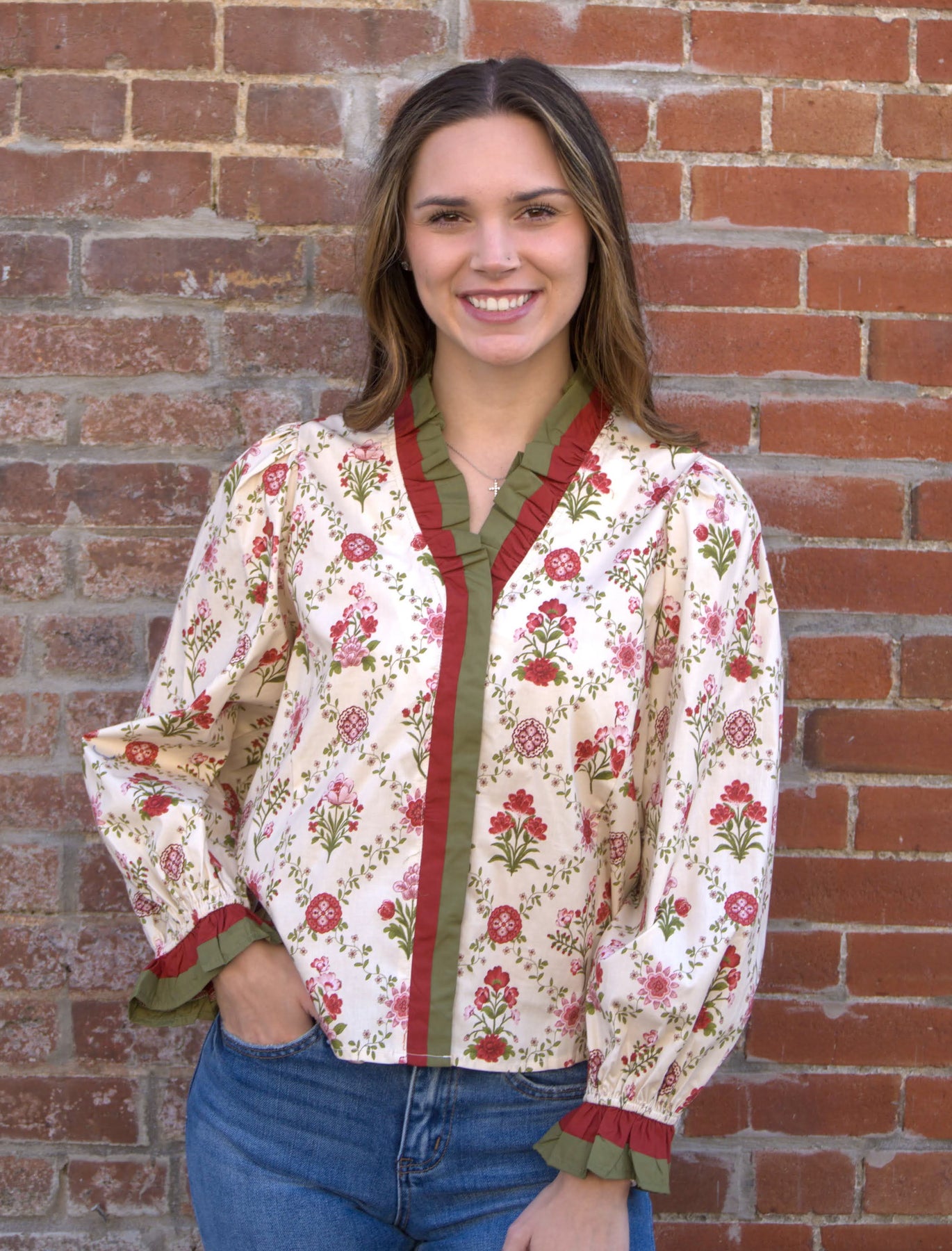Add a feminine touch to your look with this floral print top, highlighted by colorful ruffle trim along the V-neckline.