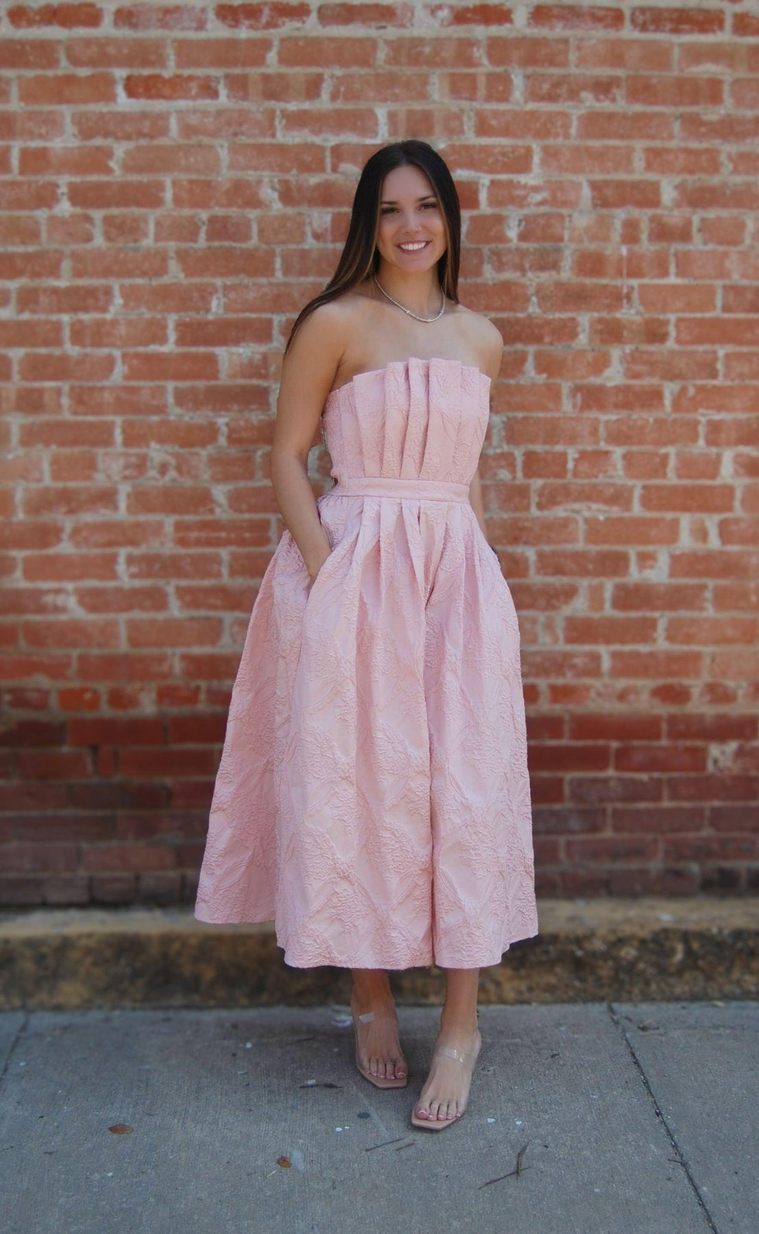 In addition to its stylish design, the Strapless Embossed Midi Dress features side pockets for added convenience. Pockets are often a sought-after feature in dresses, and this one doesn't disappoint. These pockets add practicality to an otherwise elegant piece, allowing you to carry small essentials like your phone, lip gloss, or keys without the need for an extra bag. The inclusion of pockets also adds a casual, laid-back element to the dress, making it versatile enough to wear on both formal and informal occasions.
