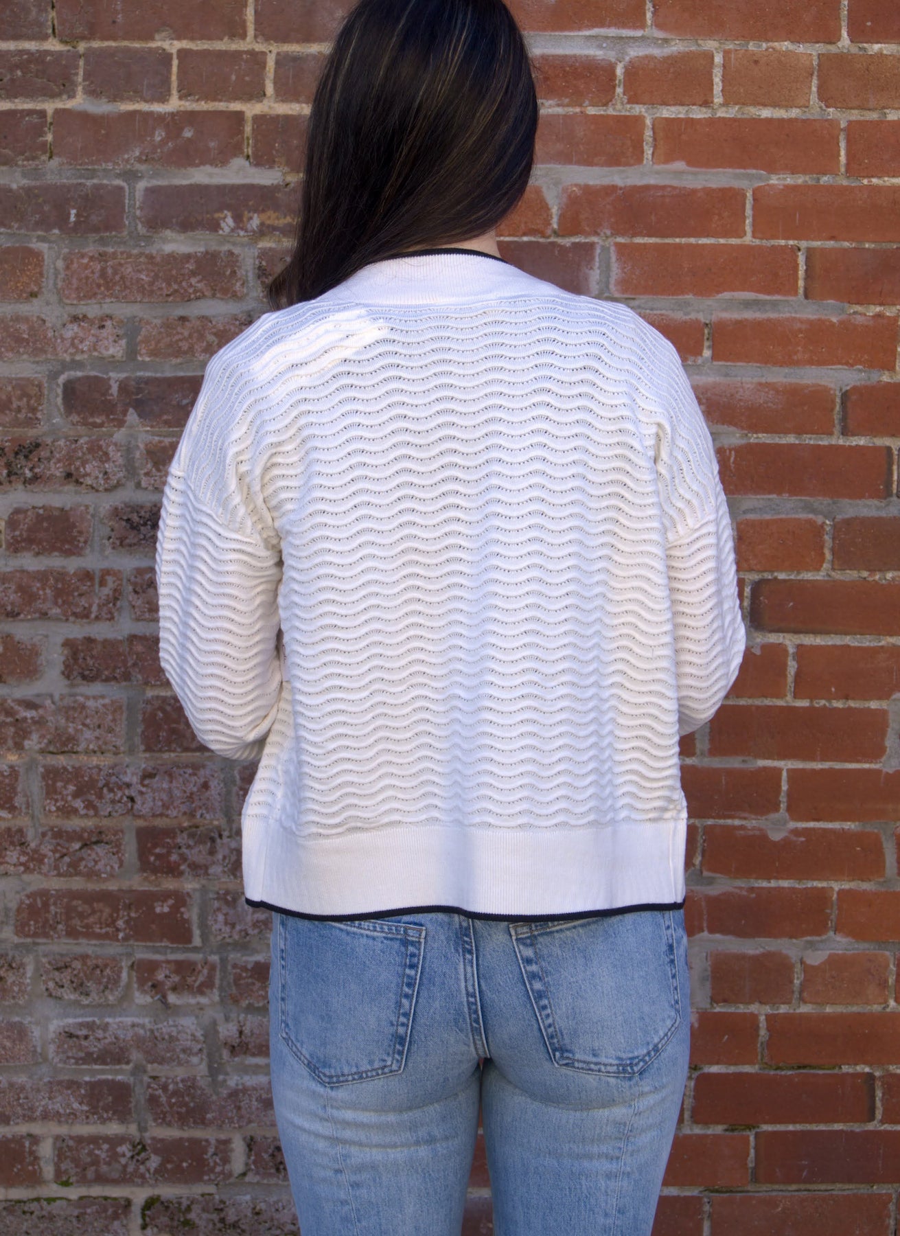 A fresh layer for fall, this textured pointelle knit cardigan combines comfort and style with a relaxed silhouette and subtle wave-like stitching for a soft, dimensional look. Designed with an open front and rib-knit bands at the neckline, cuffs, and hem, it’s elevated by contrast color trim along all edges, giving a crisp, modern finish. Lightweight and versatile, it’s the perfect transitional piece for layering over casual or dressy outfits.