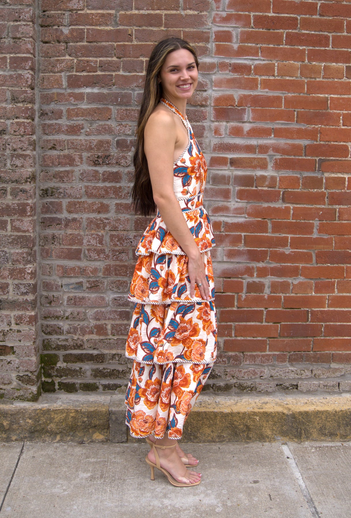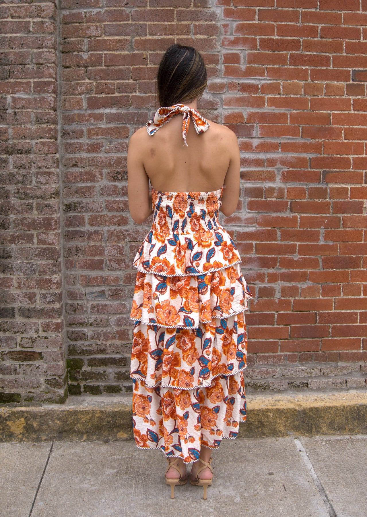 A flowy favorite with timeless charm, this tiered midi dress features a bow tie halter neckline and contrast binding accents for a chic finish. Designed with a smocked back for comfort and fit, it moves beautifully with every step. Lightweight, lined, and non-sheer, it’s the perfect choice for garden parties, brunch dates, or warm-weather celebrations.