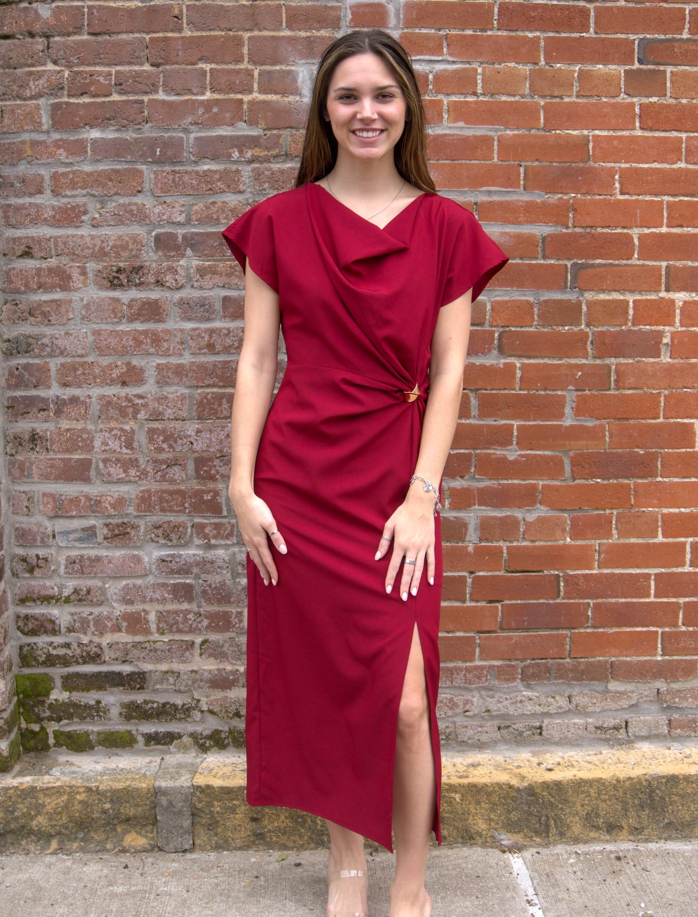 Elevate your look with this timeless short sleeve midi dress, designed to flatter every curve with effortless sophistication. The elegant draped neckline and side ring gathering create a graceful silhouette that enhances your natural shape. Fully lined for comfort and confidence, this woven midi dress offers a refined balance of structure and flow. Perfect for special occasions, evenings out, or any moment that calls for understated elegance.