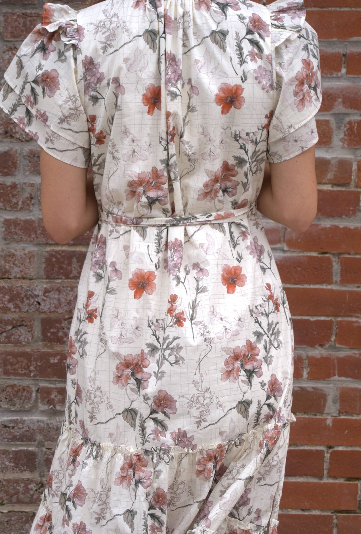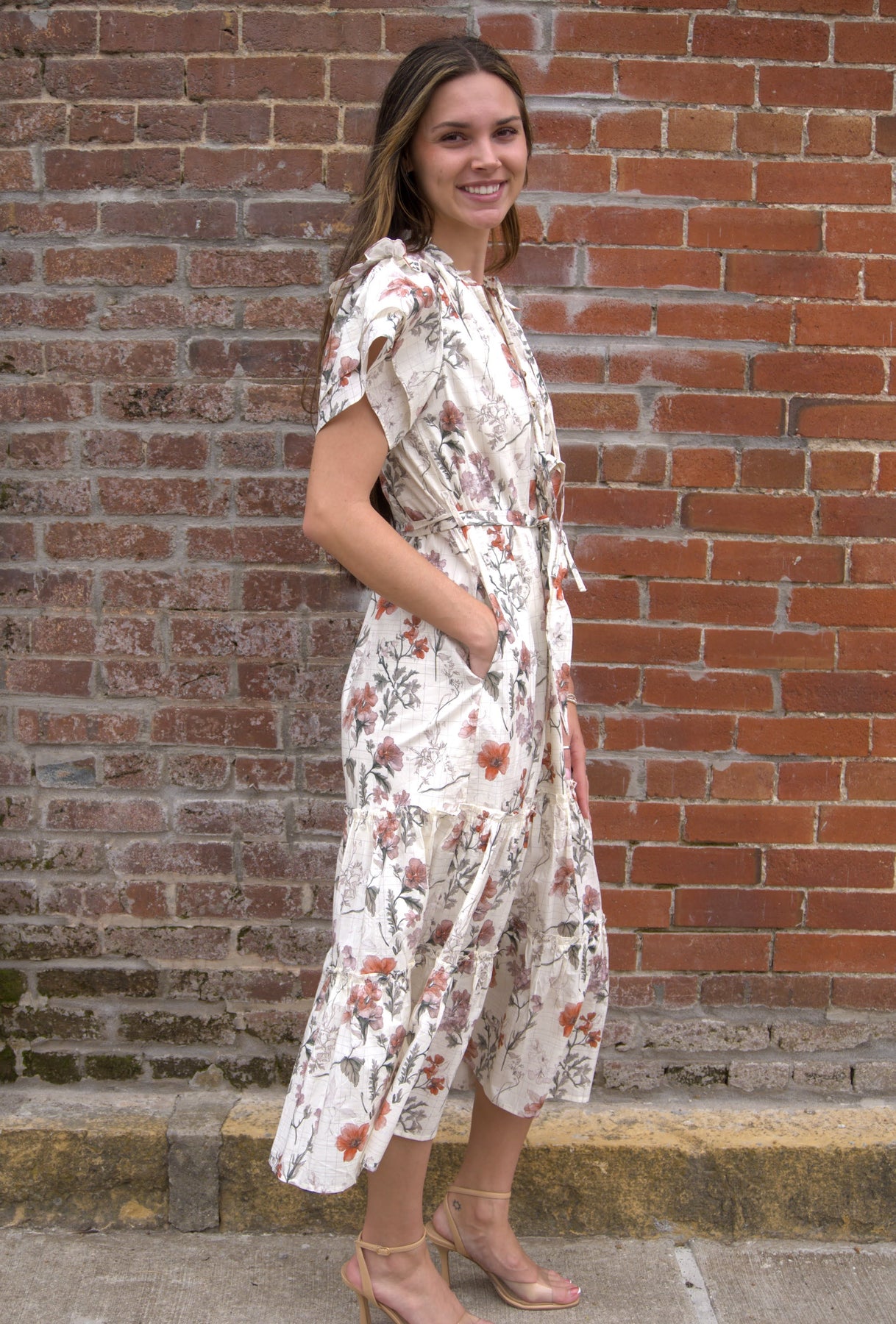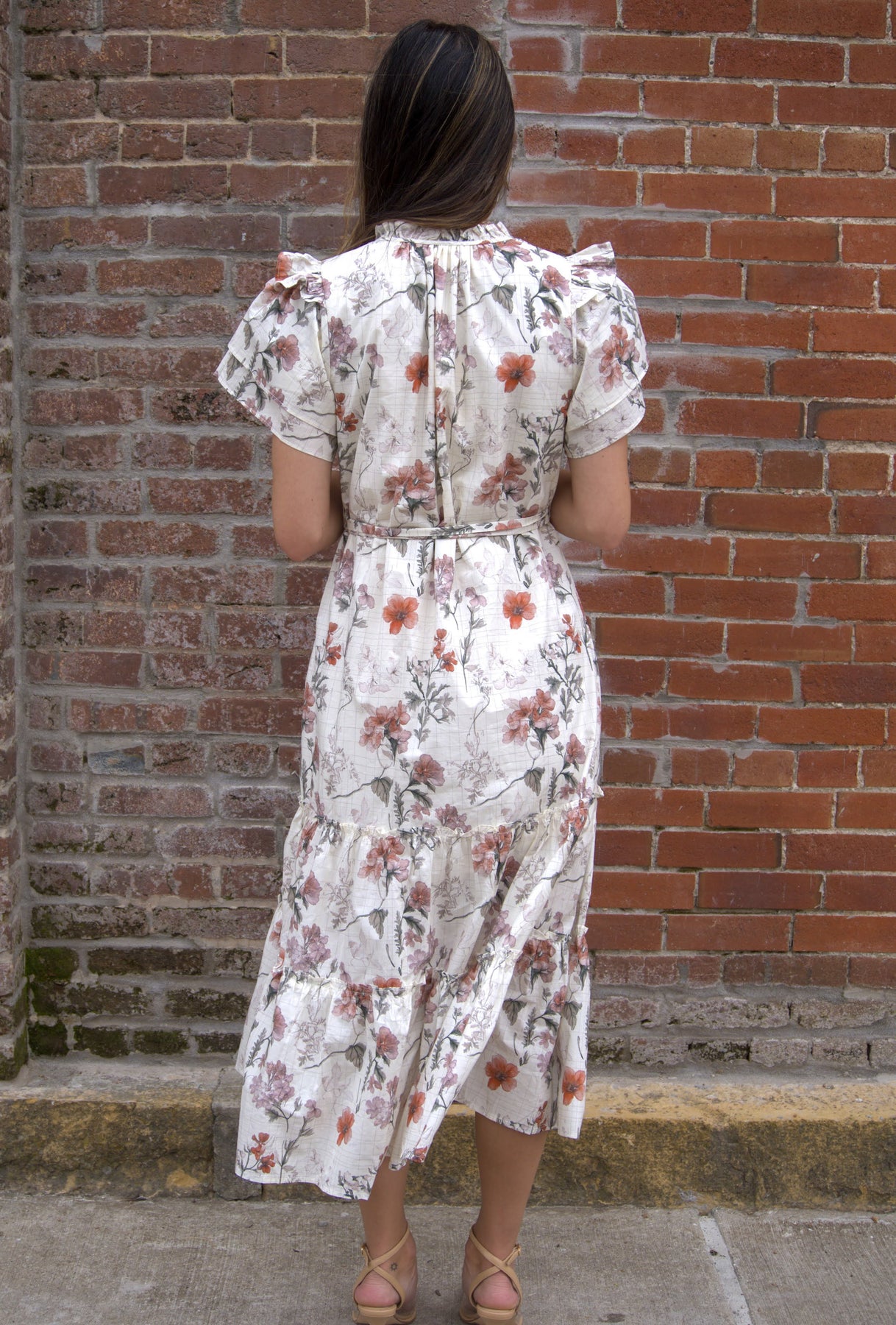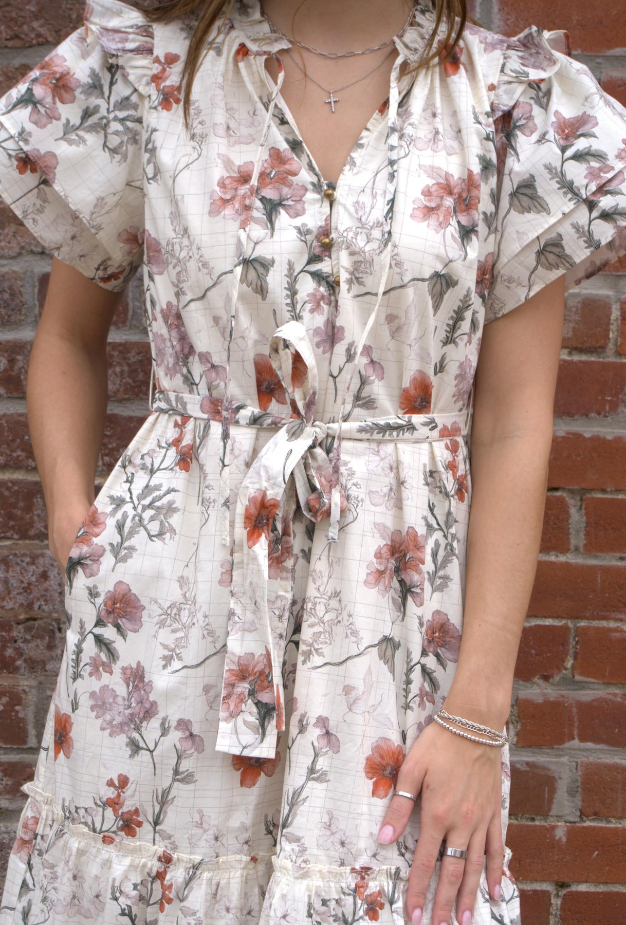 A timeless floral favorite, this midi dress features flutter sleeves, a ruffled collar, and a V-neckline with a delicate tie for added charm. A cinched waist with an adjustable tie flatters the figure, while side pockets bring everyday ease. Crafted in 100% lightweight cotton, it’s fully lined, non-sheer, and perfect for warm-weather days, garden strolls, or casual gatherings.