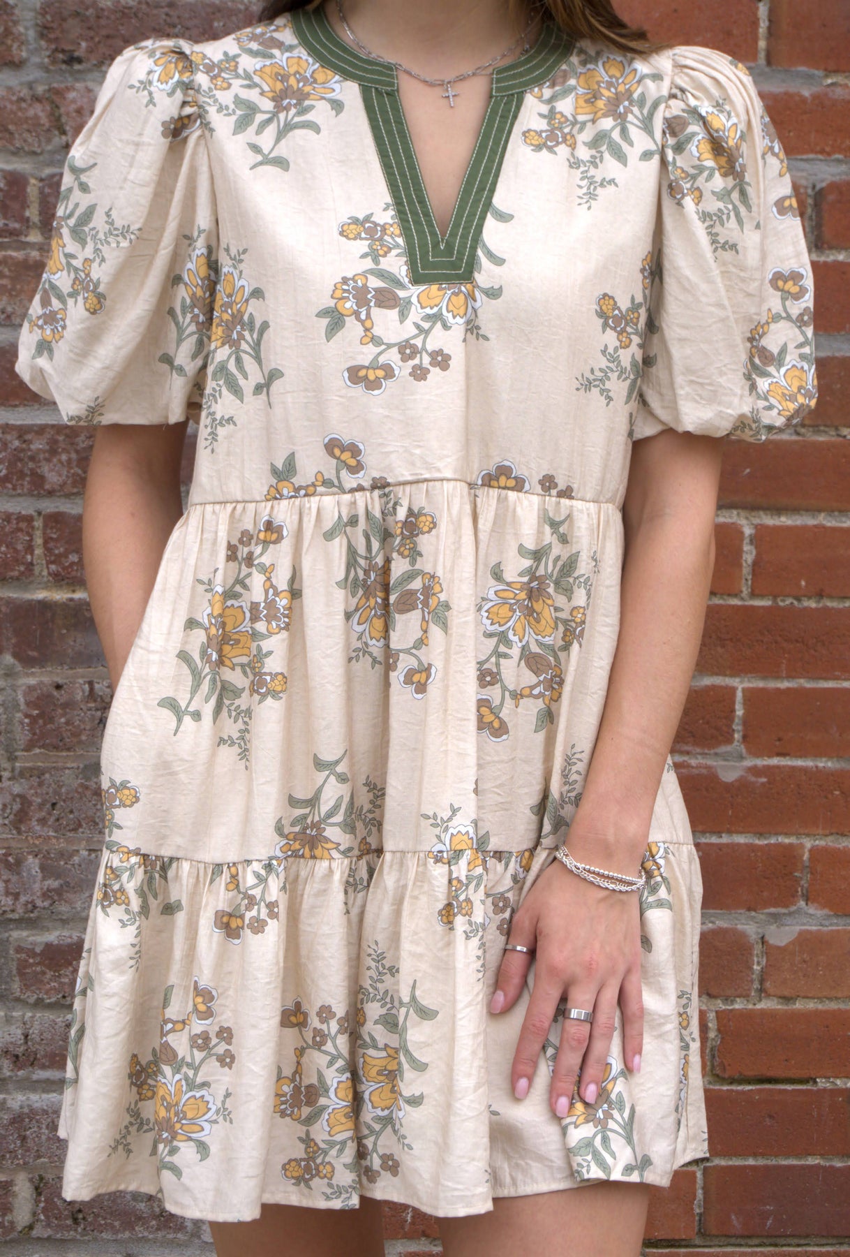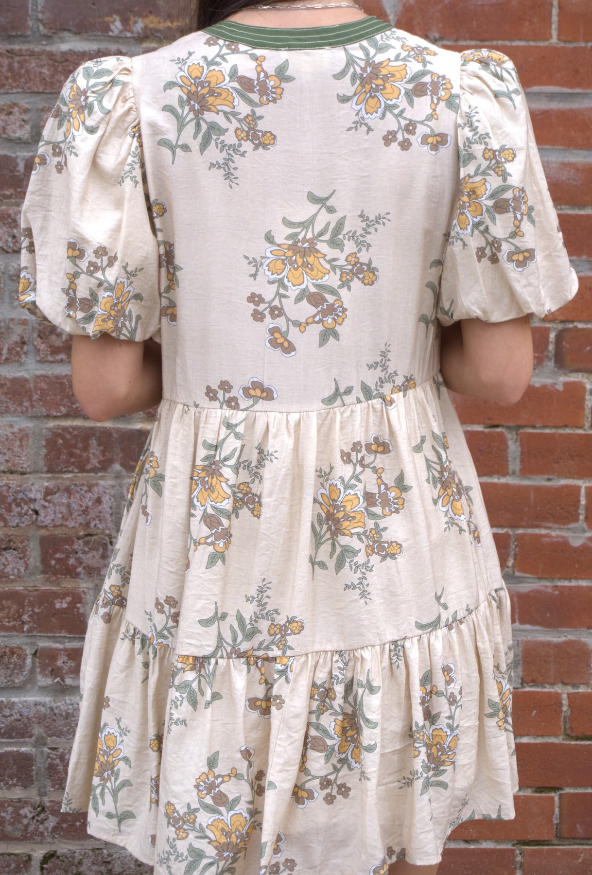 A fresh take on florals, this mini dress features short puff sleeves, a flattering V-neckline with contrast binding, and visible topstitch details for subtle definition. Crafted from a lightweight woven fabric, it’s fully lined for easy wear and finished with side pockets (because every dress is better with them). Perfect for warm days, weekend outings, or layered with a jacket into fall.
