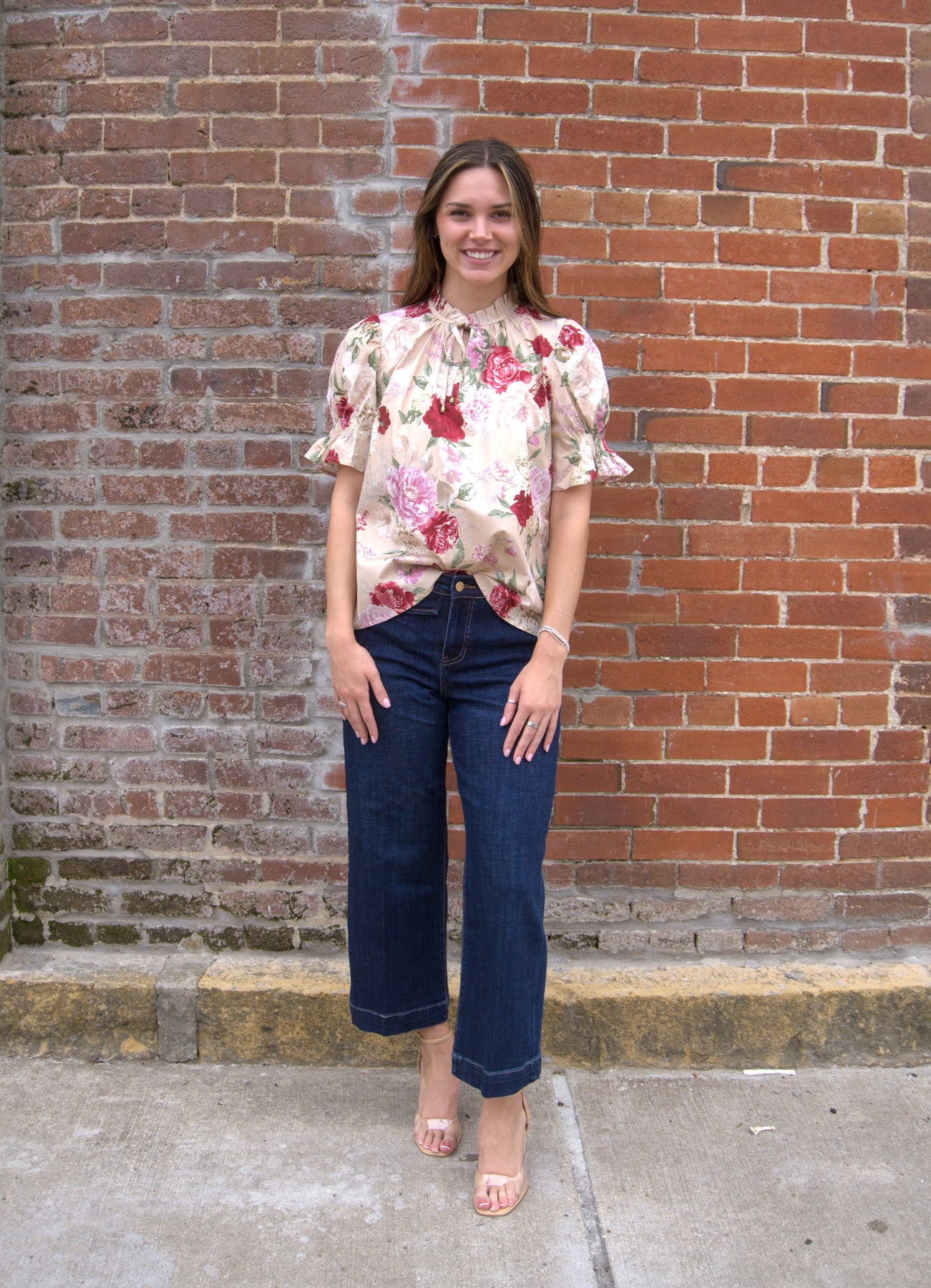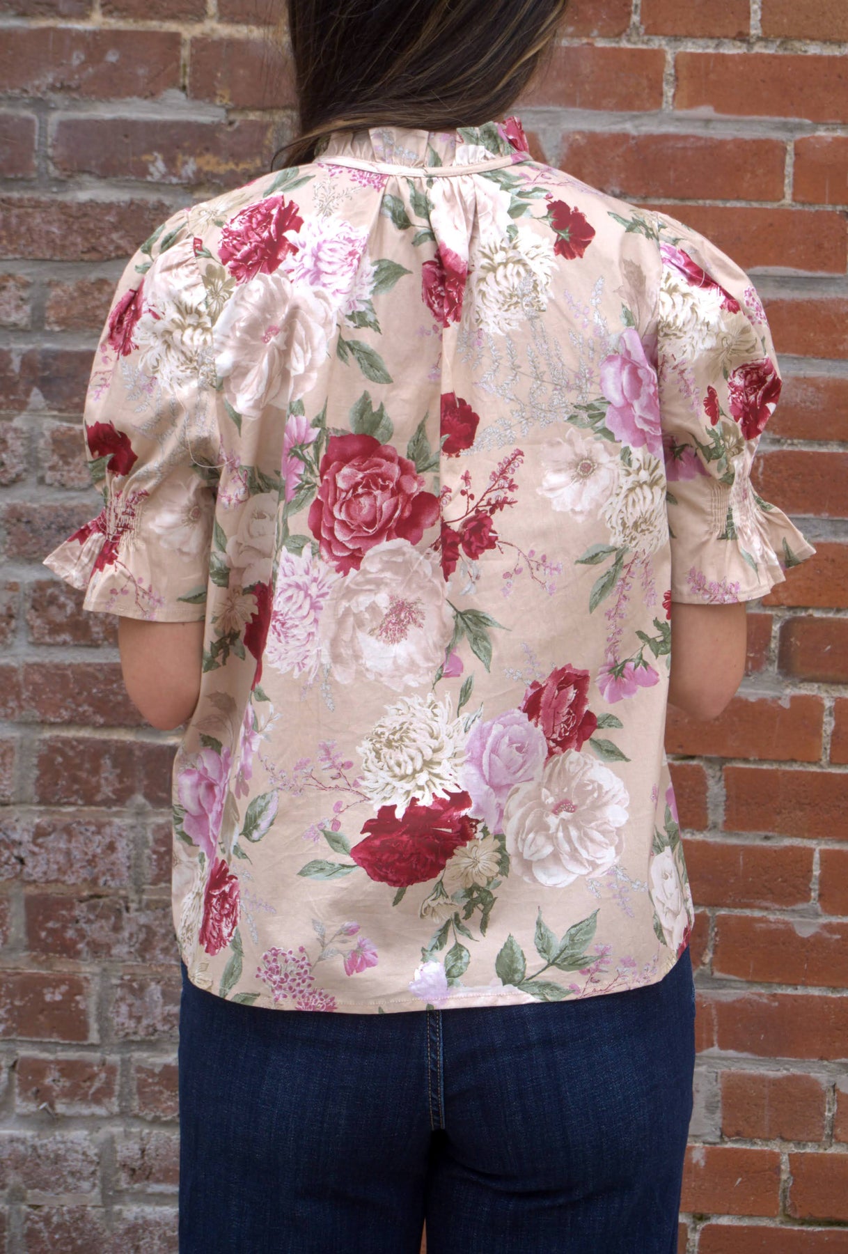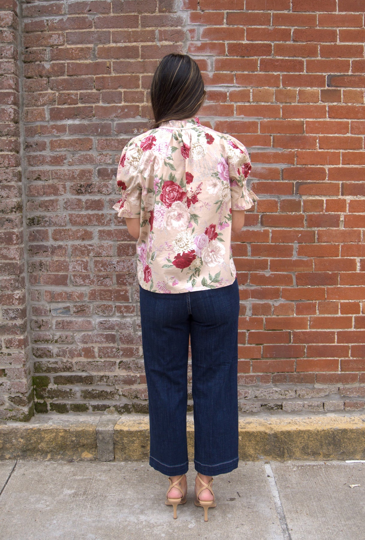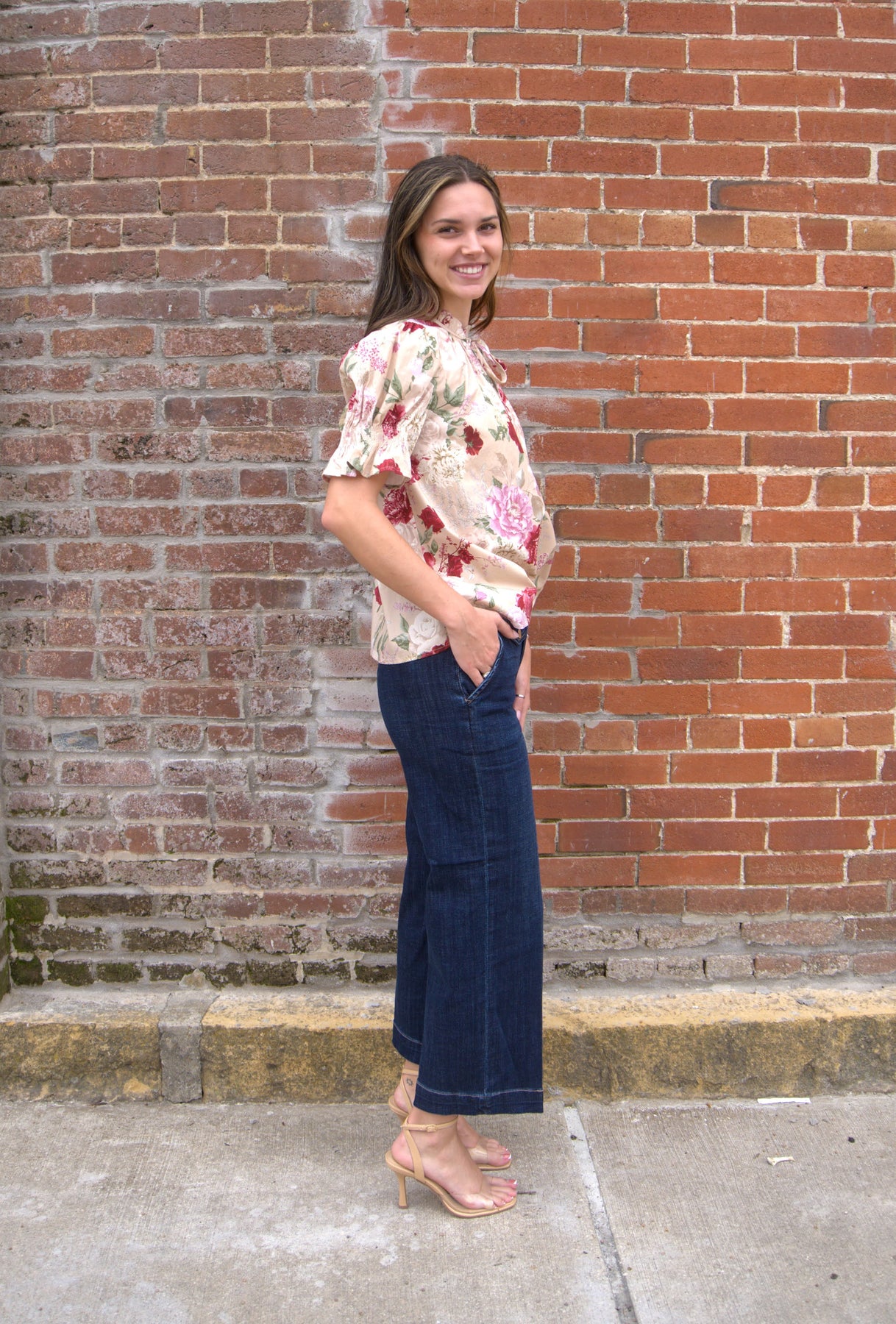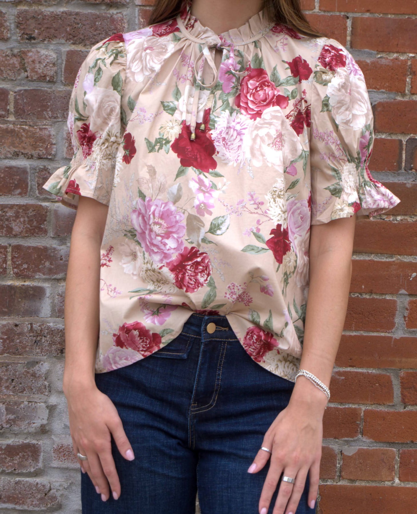 This charming floral print top is designed with a smocked bodice, short puff sleeves, and delicate ruffle finishes for a romantic touch. The V-neckline adds a flattering detail, while the lightweight woven fabric offers comfort and breathability. Perfect for pairing with denim, skirts, or layering under a blazer for a soft, feminine look.