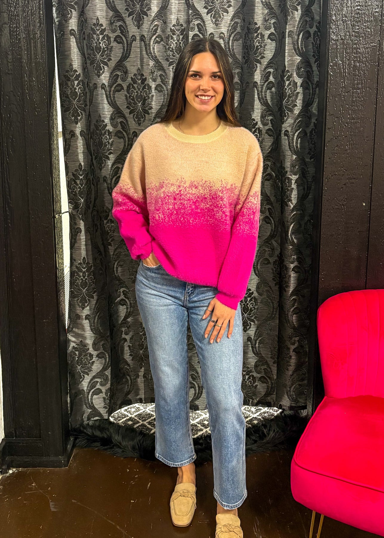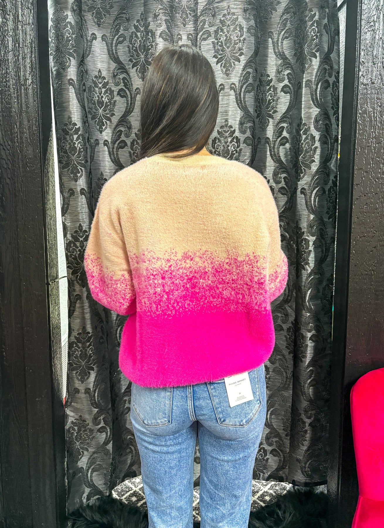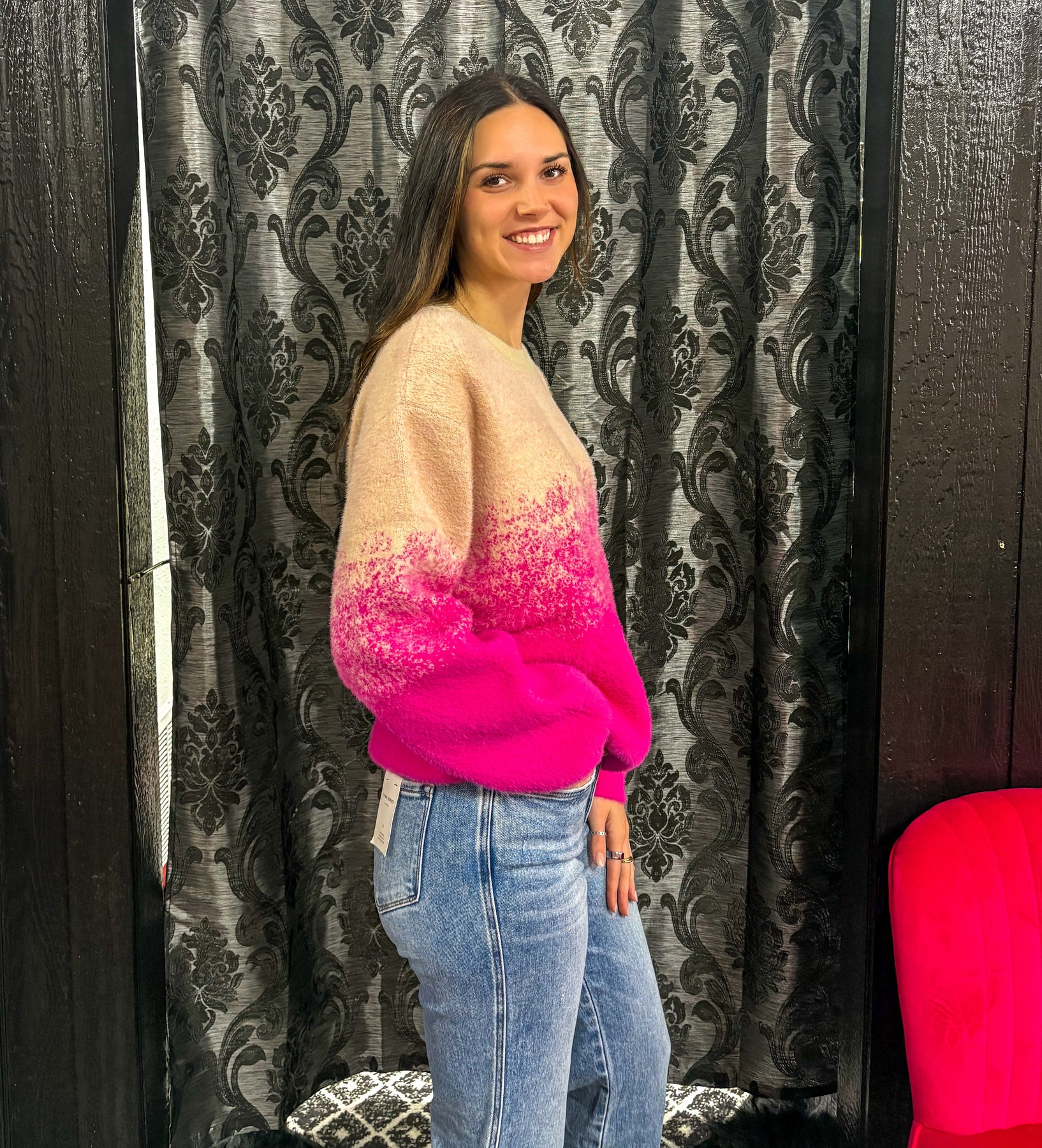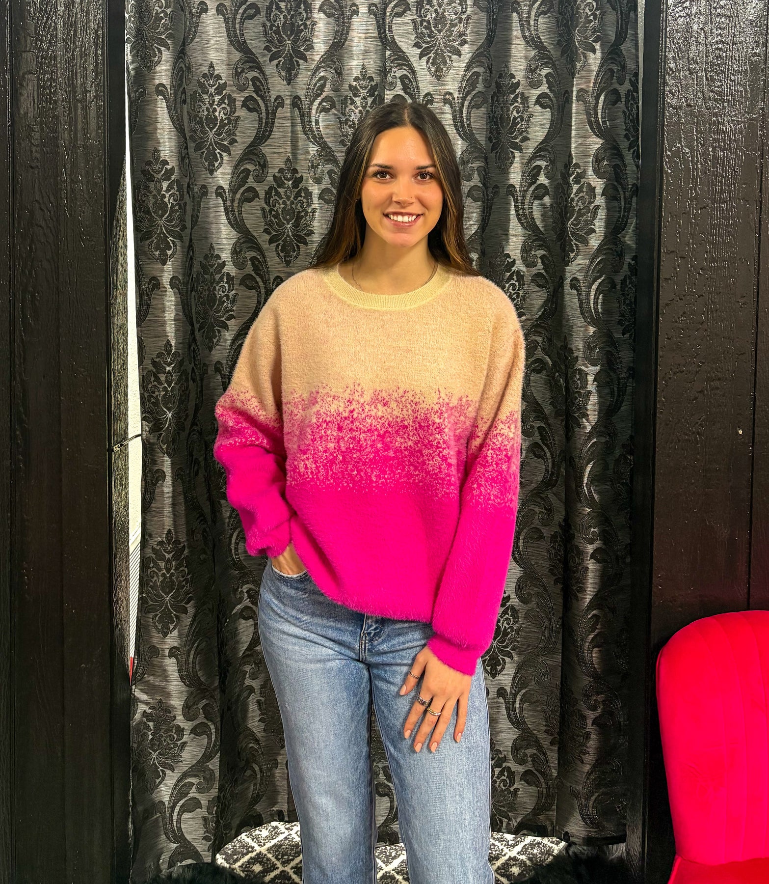 This luxuriously soft and cozy pullover sweater is defined by its striking ombre design and plush texture. Crafted from a fuzzy eyelash knit, it offers unparalleled comfort and a rich, touchable feel. The sweater features a beautiful color gradient that transitions from a warm dusty rose at the hem. An artistic, speckled pattern marks the transition between the two hues, adding a modern and unique touch to the classic silhouette. With its relaxed fit and long sleeves, this ombre knit sweater is the epitome of effortless style and cozy sophistication, perfect for both lounging in luxury and chic casual wear.