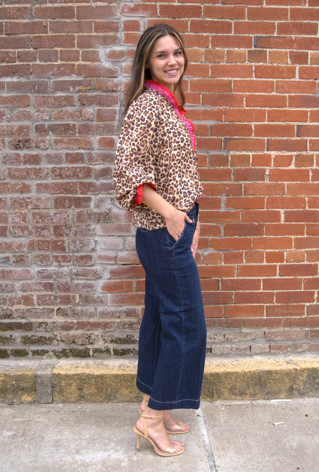 Unleash your wild side with this lively leopard print top, finished with eye-catching wavy stripe trim along the long sleeves. Its unique contrast detail adds a fun twist to classic animal print, making it the perfect piece for standing out in style. Crafted from a soft, lightweight blend, it’s as comfortable as it is chic—ready to bring a pop of personality to any outfit.