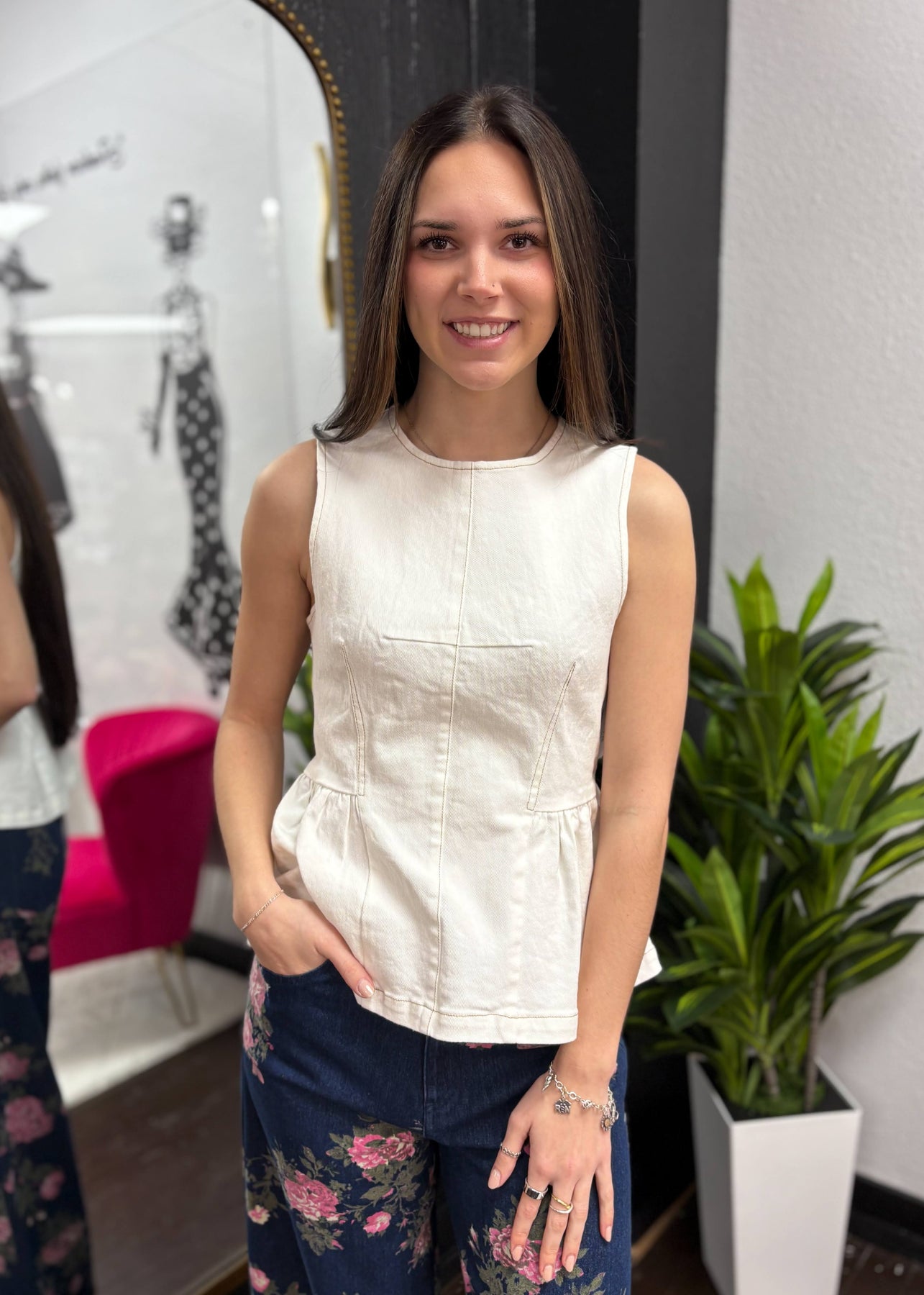 The Lily Peplum Top is a stylish off-white denim blouse featuring a flattering peplum silhouette that cinches at the waist and flares gently for a feminine shape. Accented with subtle brown stitching, it adds a touch of contrast and detail for a polished, casual-chic look. Perfect paired with jeans, skirts, or tailored pants, this top combines comfort with effortless style.
