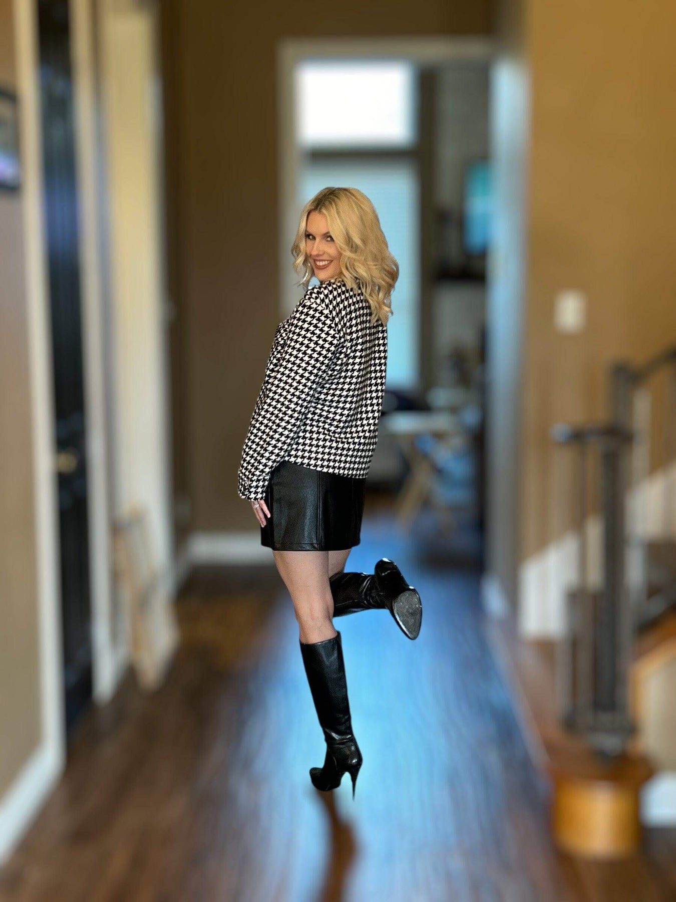 Complete your every day look with this fashion forward boxy shacket. This jacket features a beautiful houndstooth print and a subtle side slit at the hem.