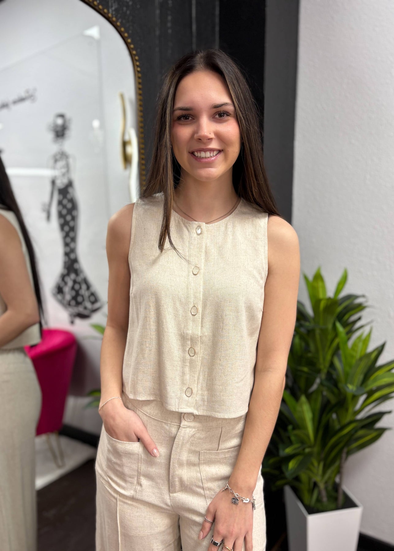 Coastal Linen Top-Button Detail,Button Front,clothing,Cropped,Entro,Linen,Linen Blend,Mother of Pearl,Tank Top,Top,Tops,Women,women&