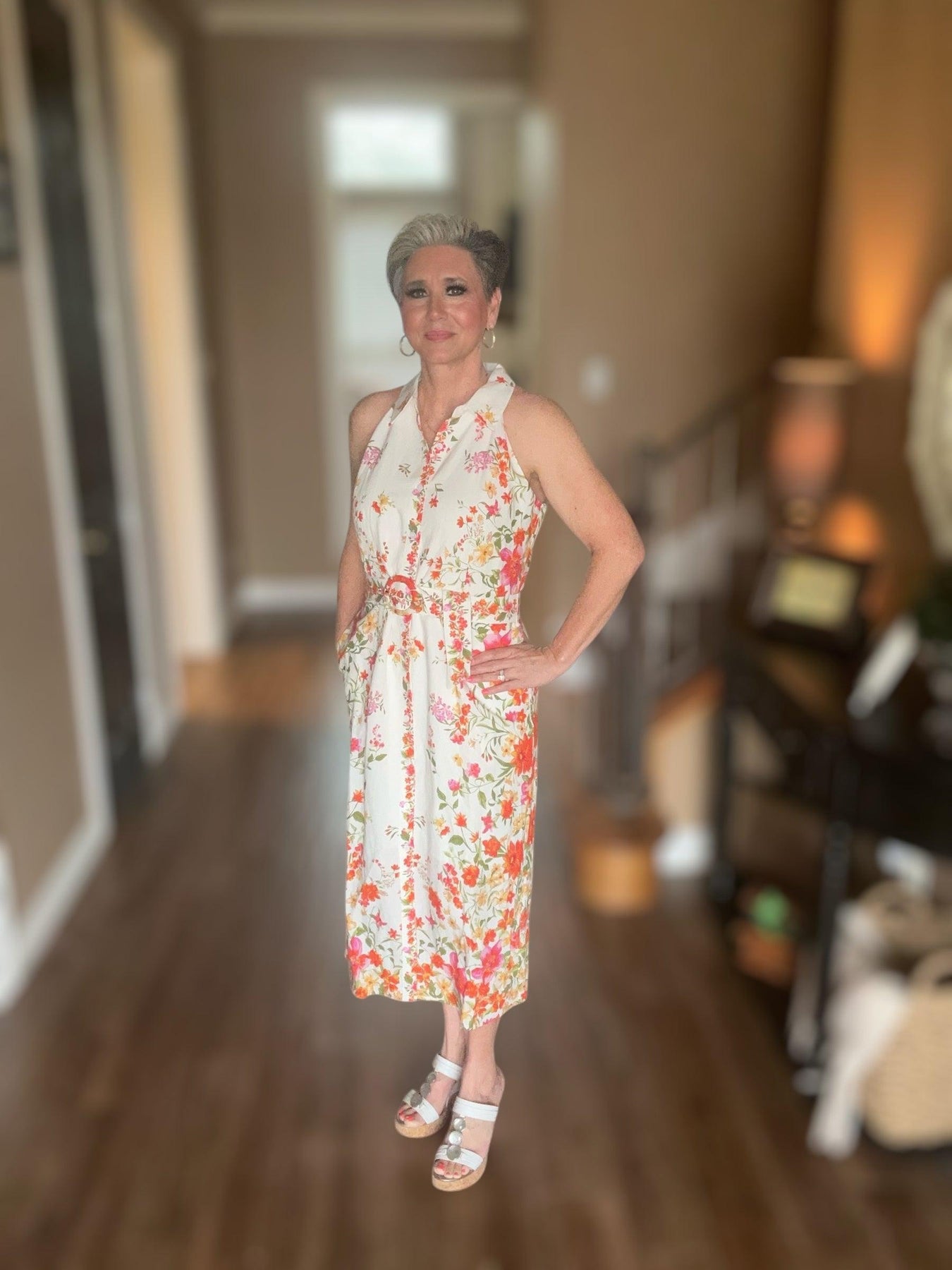 The dress features a classic, sleeveless design, ideal for warmer weather. The sleeveless cut offers a sleek, breezy feel that allows for easy movement, while the clean lines of the dress keep the focus on the beautiful floral print. It’s the perfect option for those sunny days when you want to stay cool yet still look chic. If you're looking to layer for cooler evenings, this dress pairs effortlessly with a light cardigan, denim jacket, or your favorite blazer, making it a versatile piece you can wear all year round.