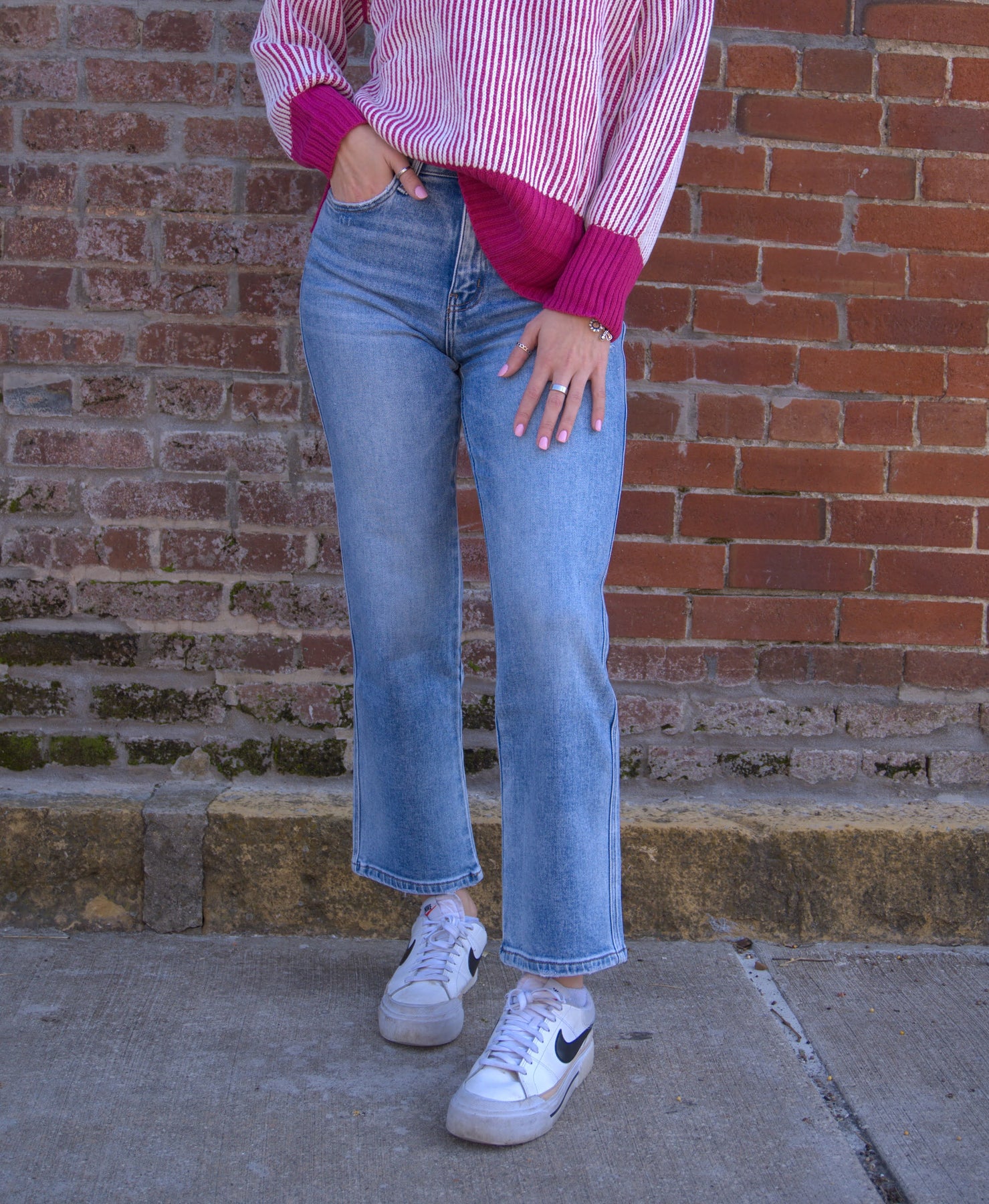 Meet your new everyday denim—our High Rise Ankle Straight Jeans deliver timeless style with a modern fit. Designed in soft comfort stretch denim, they feature a flattering 10.5″ high-rise waist, ankle-length cut, and finished hem for a clean, versatile look. The medium-light wash gives them that perfectly lived-in feel, making them easy to pair with everything from flowy blouses to casual knits.