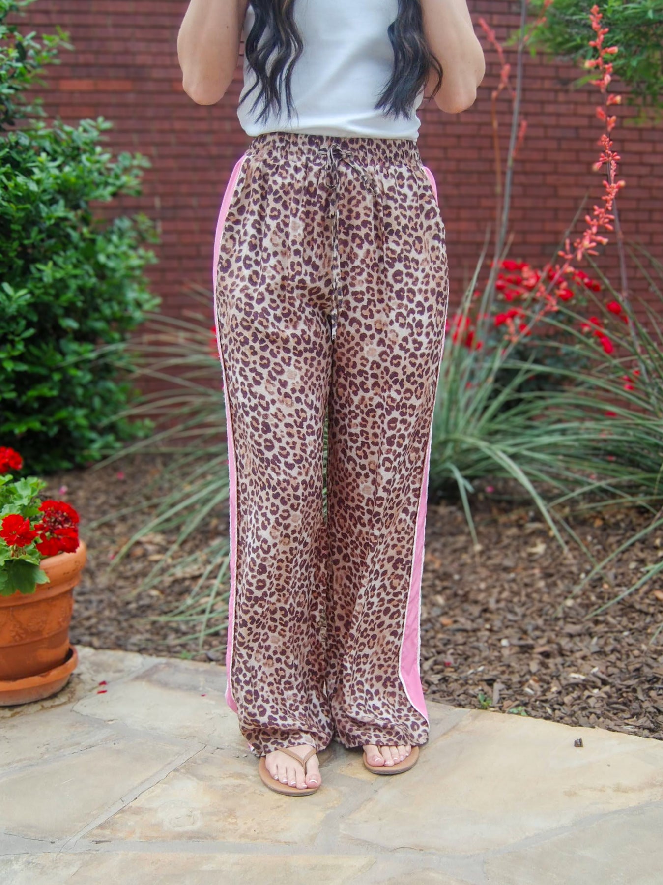 Leopard Print Wide Leg Pants-Animal Print,Bottoms,clothing,Hi-Waist,High Rise,leopard,Leopard Print,Pants,Pink Binding Detail,Sale,Tie Waist,Wide Leg,Women,women&