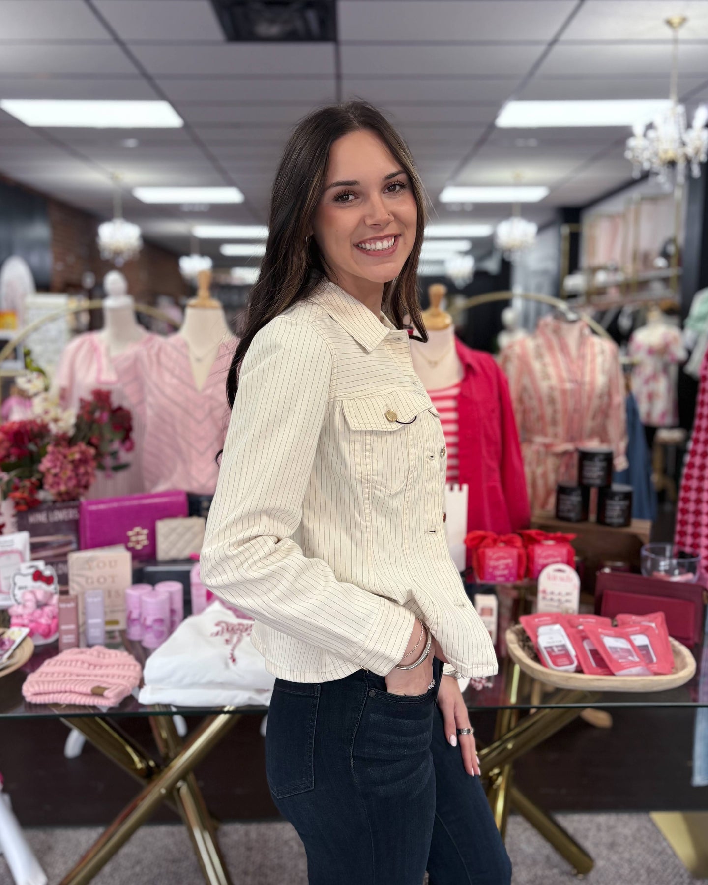 Softly structured yet effortlessly feminine, this fit-and-flare trucker jacket brings a fresh, boutique-inspired twist to classic denim styling. Gently cinched at the waist and flaring slightly for a flattering silhouette, it adds subtle shape while remaining easy and comfortable to wear. Nautical-inspired stripes lend a crisp, coastal charm, perfect for spring and summer layering. Finished with classic trucker details, it pairs beautifully with white denim, tailored shorts, or a simple dress for elevated, everyday style.