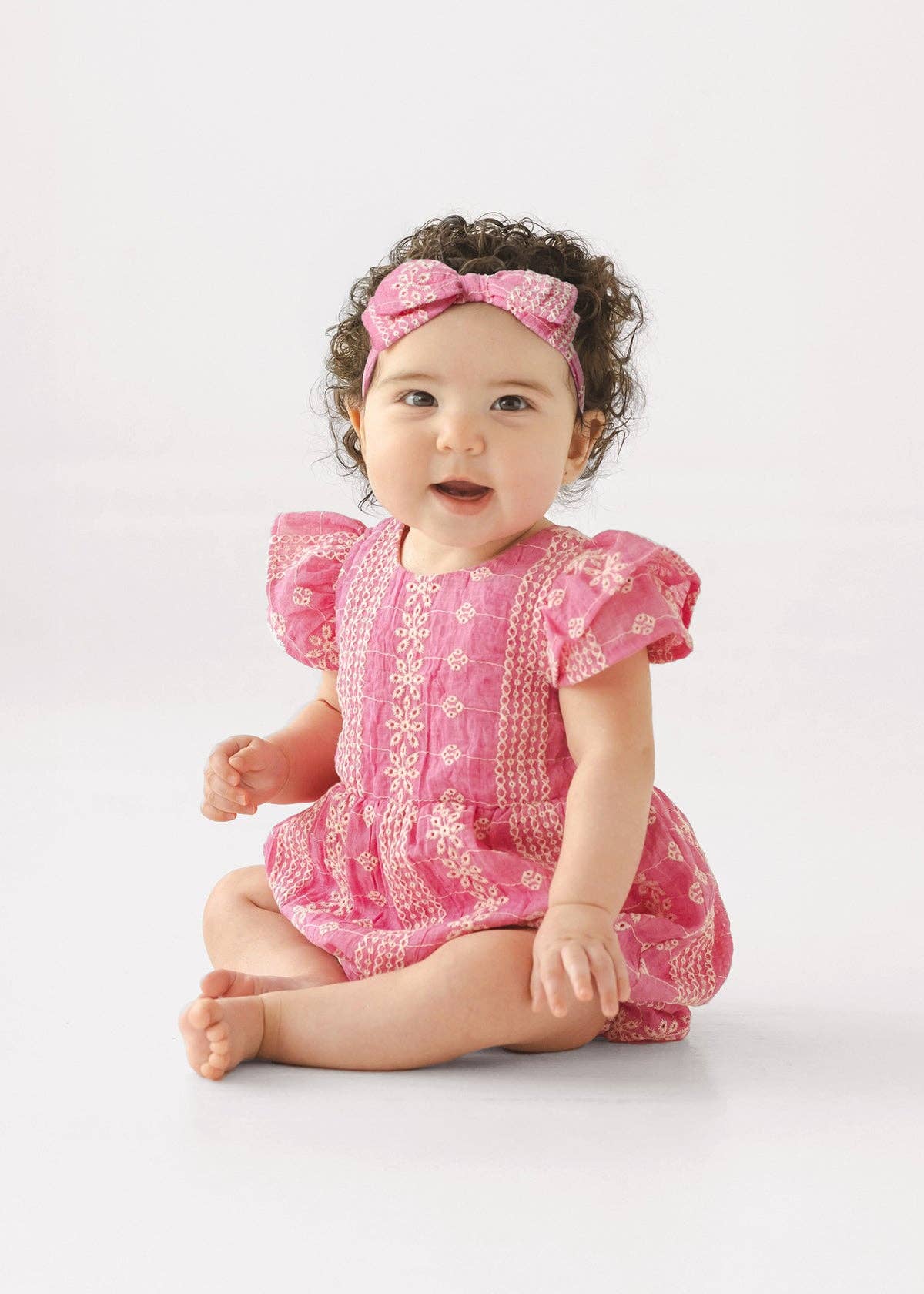 Sweet, airy, and perfect for warm days, this vibrant pink romper is designed with both comfort and charm in mind. Made from soft, lightweight fabric, it features delicate white eyelet embroidery throughout for a timeless, feminine touch.
