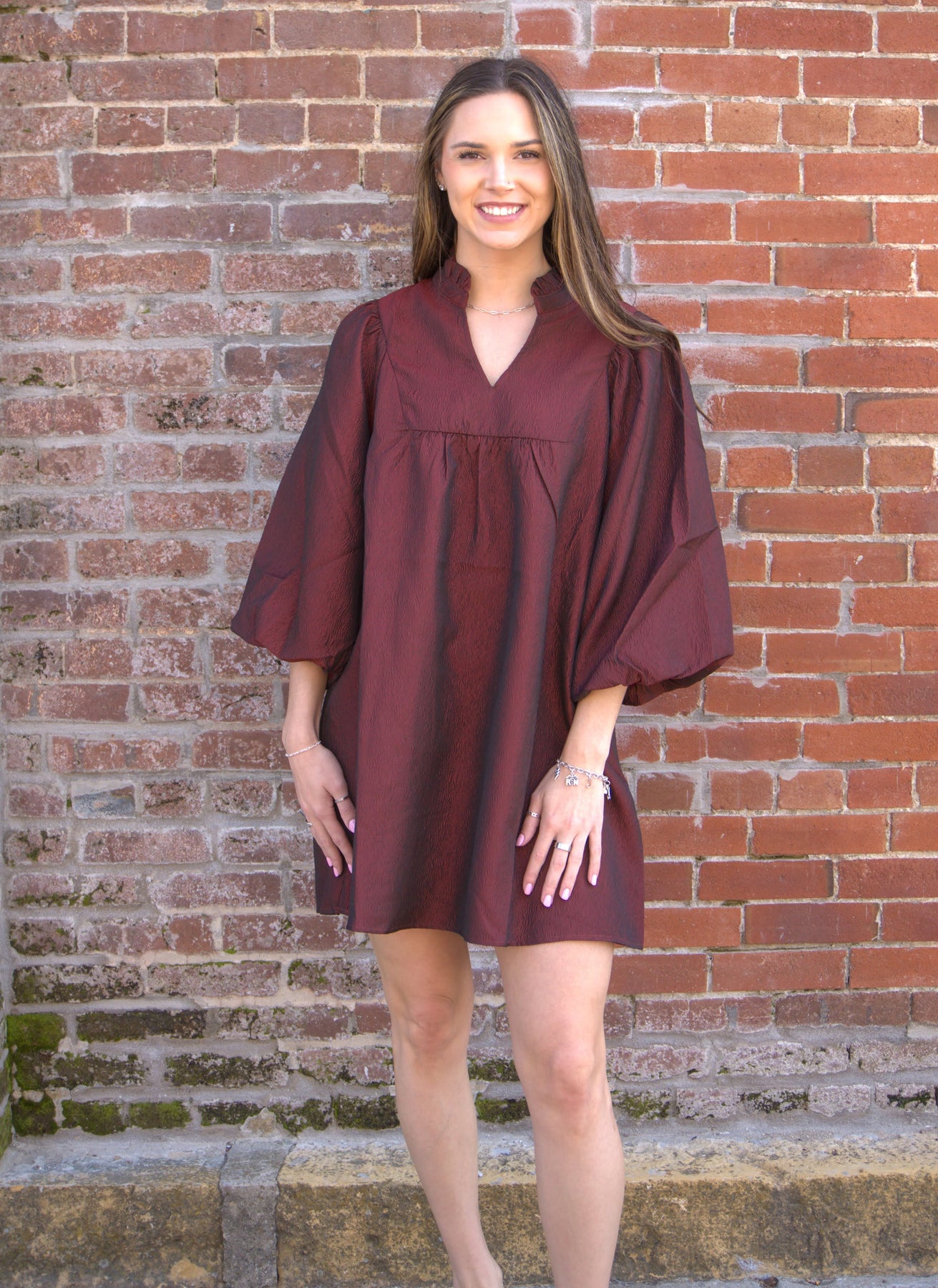 The Colette Balloon Sleeve Dress-Babydoll,Balloon Sleeve,clothing,dress,dresses,JODIFL,Mini Dress,Ruffle Trim,Split V-Neck,Textured,Women,women&
