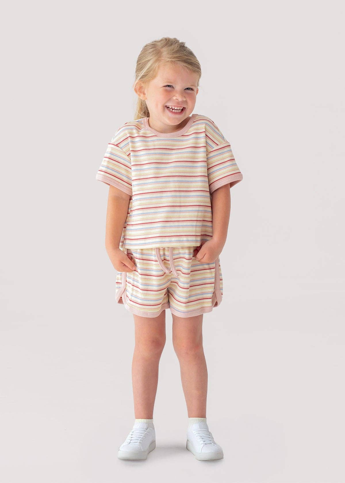 Playful multi-color horizontal stripes bring a fun pop of personality, beautifully accented with delicate light pink trim for a sweet finishing touch. Perfect for playdates, lounging, or everyday wear, this set blends comfort and charm effortlessly.